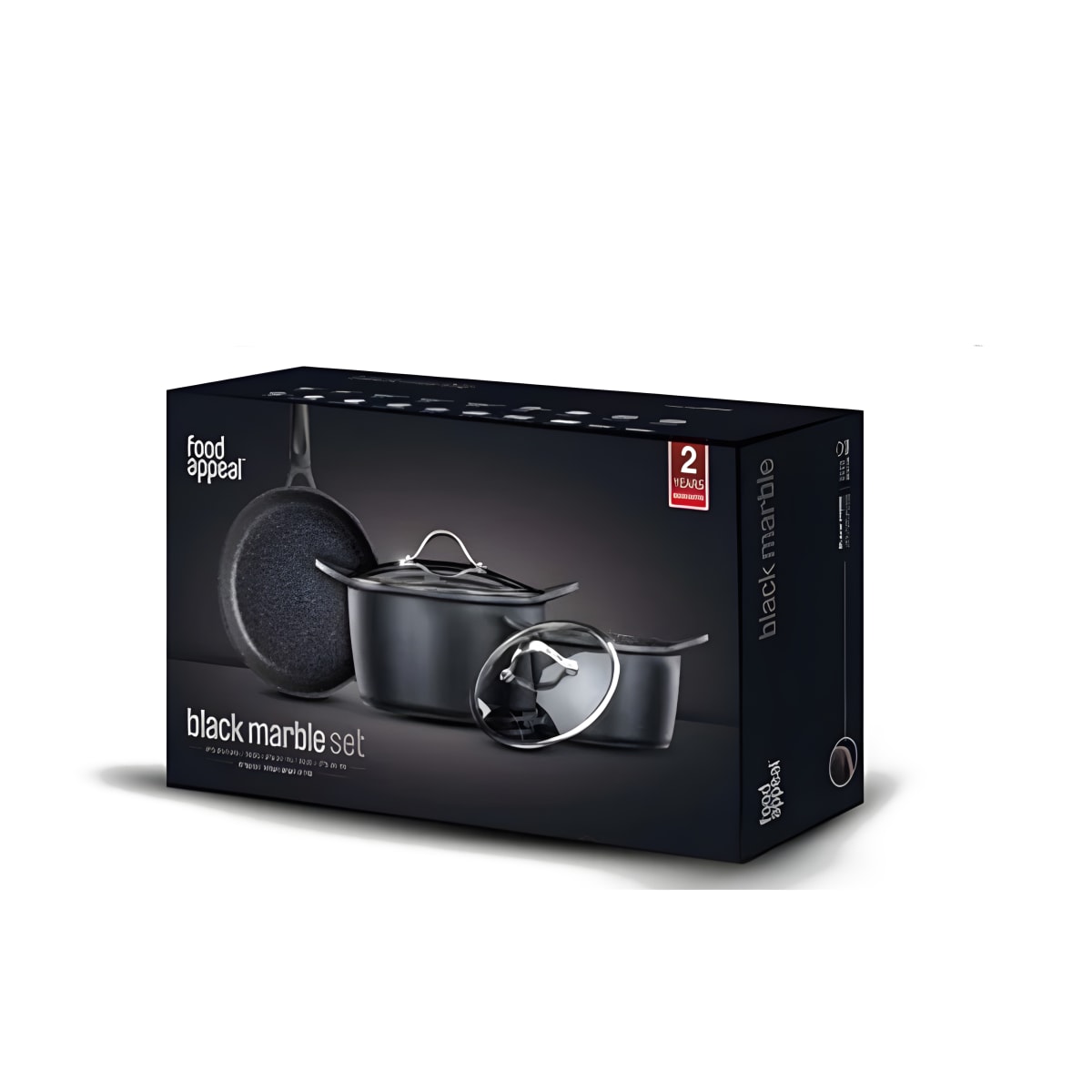 בוסט למטבח המובחר שלך עם סט בישול מהודר 5 חלקים מבית FOOD APPEAL, הכולל סירים ומחבתות עם ציפוי שיש שחור.הסט כולל: סיר 20 ס"מ - חימום אחיד וב