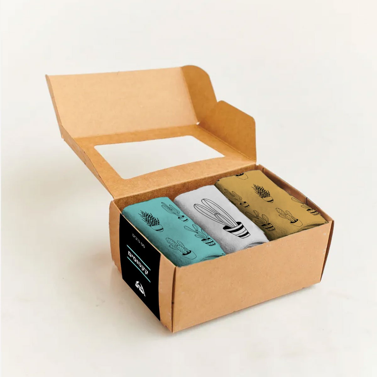 גלה את סט הגרביים הממותגות שלנו, הכולל 3 זוגות מדליקים מבד אלסטי שמתאים להדפסה צבעונית בכל חלקי הגרב. דגם קקטוסים ודגם חמסה ייחודיים. המחיר כולל הדפסה צבעונית במארז.
