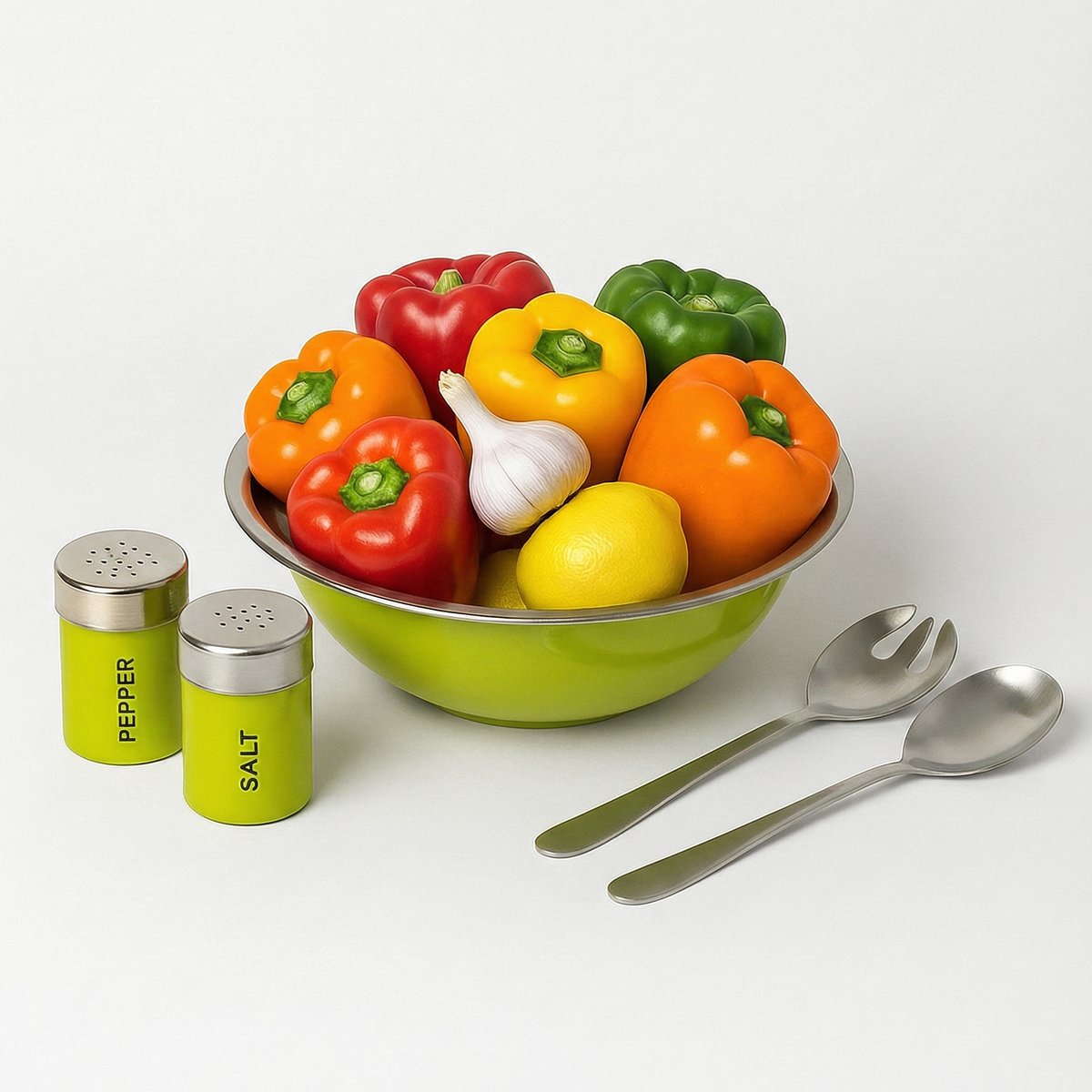 גלה את הסט המושלם לסלט שמציע קערת מתכת בעיצוב מודרני בקוטר 28 ס"מ, שייקן מלח יוקרתי, שייקן פלפל תואם ושתי כפות סלט מקצועיות לכל צרכי ההכנה.