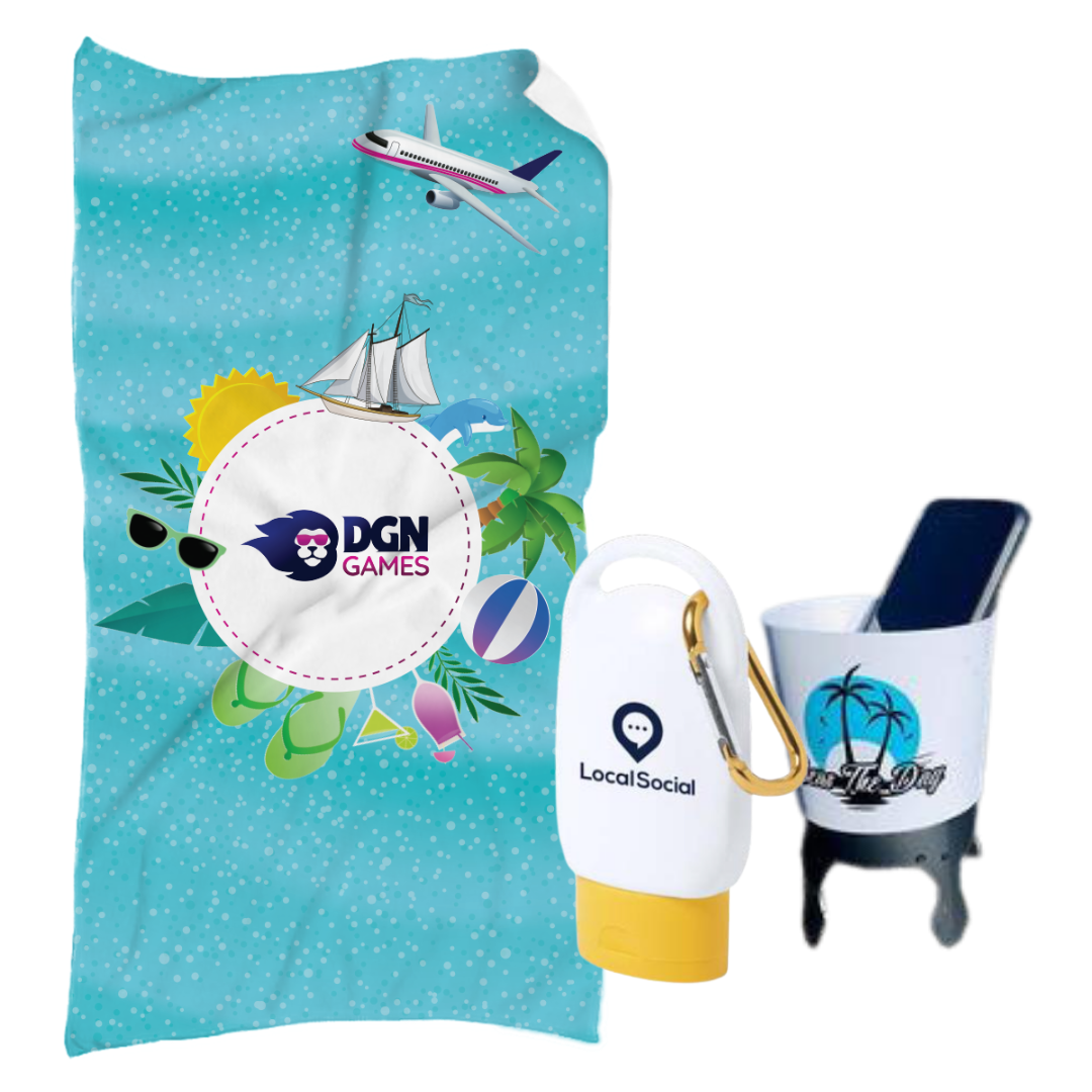 סט קיץ מושלם לחוף הים, המשלב מגבת חוף מפנקת ורכה, מיני מקדם הגנה עם שאקל שניתן לתלות על התיק לנוחות מקסימלית, ומחזיק כוסות/בקבוקים נייד שישמור על המשקה שלכם בהישג יד וללא חול.