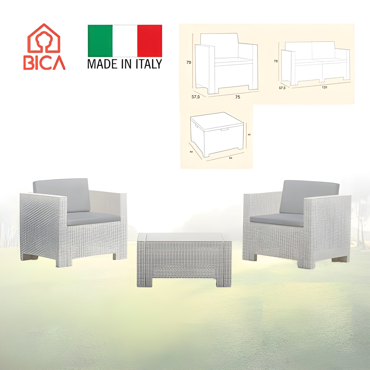 הכירו את סט הריהוט הגן היוקרתי שלנו, קולורדו לבן, תוצרת איטליה. סט מושלם לעיצוב אלגנטי ומודרני של המרפסת או החצר שלכם.הסט כולל:שתי ספות יחיד