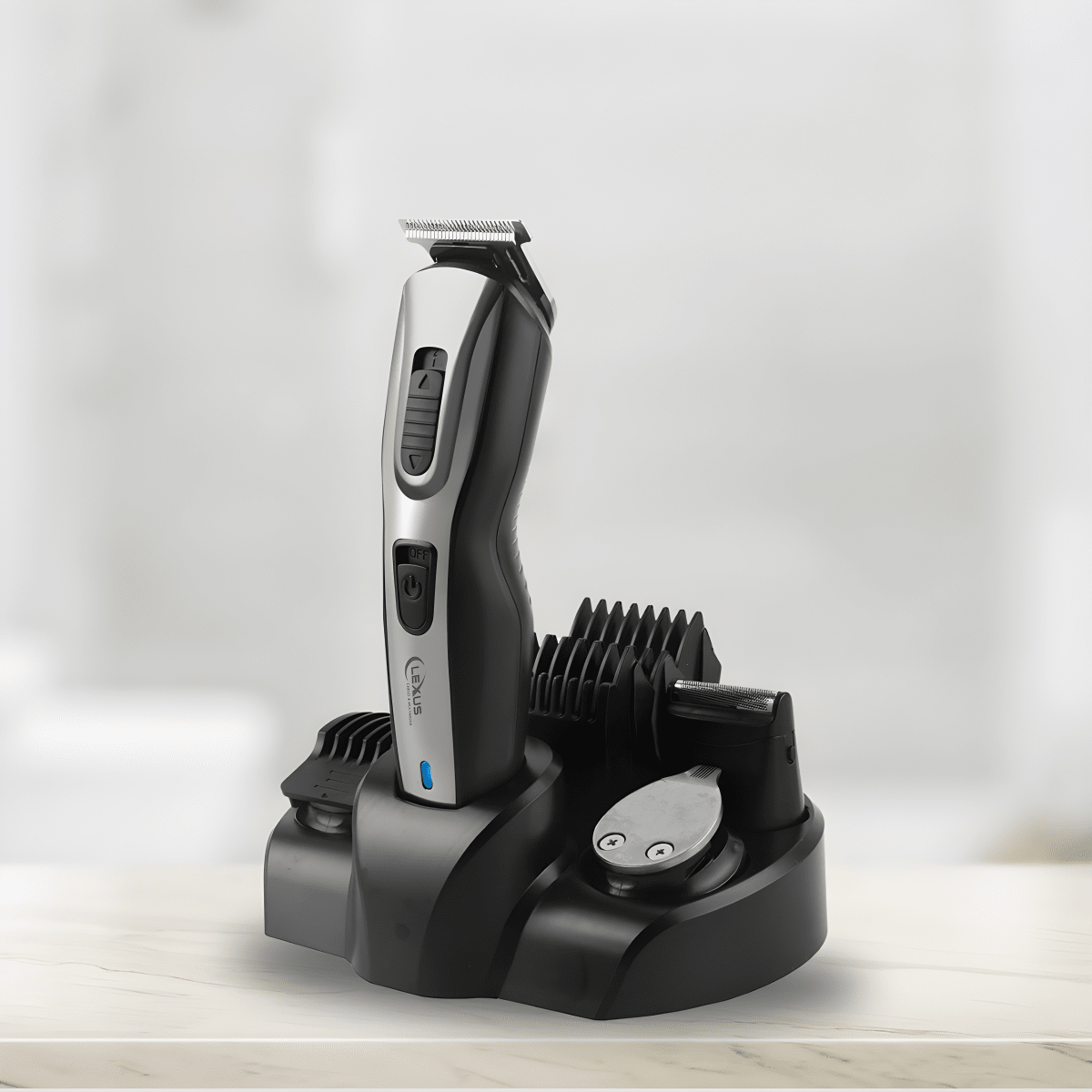 Enhance your grooming routine with the LEXUS 10-in-1 Men's Grooming Set. This powerful rechargeable trimmer offers perfect haircuts and shaves.