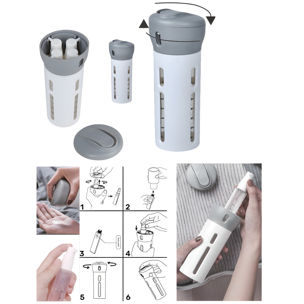 ערכת נסיעות קומפקטית ונוחה הכוללת 4 בקבוקונים קטנים בתוך בקבוק גדול אחד. כל בקבוקון בקיבולת 40 מ"ל, מה שמאפשר לשאת נוזלים בקלות ללא הסתבכות