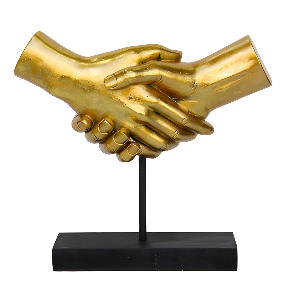 פסל אומנותי מוזהב של ידיים לוחצות עם בסיס שחור