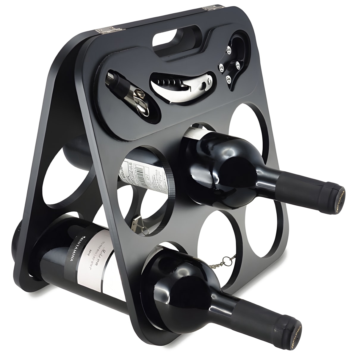העניקו לערב היין שלכם ייחוד עם סט אביזרי יין מעוצב המגיע בעמדת עץ איכותי לאחסון 6 בקבוקים. הסט כולל פותחן יין מקצועי, פקק מתכתי למניעת שפיכה