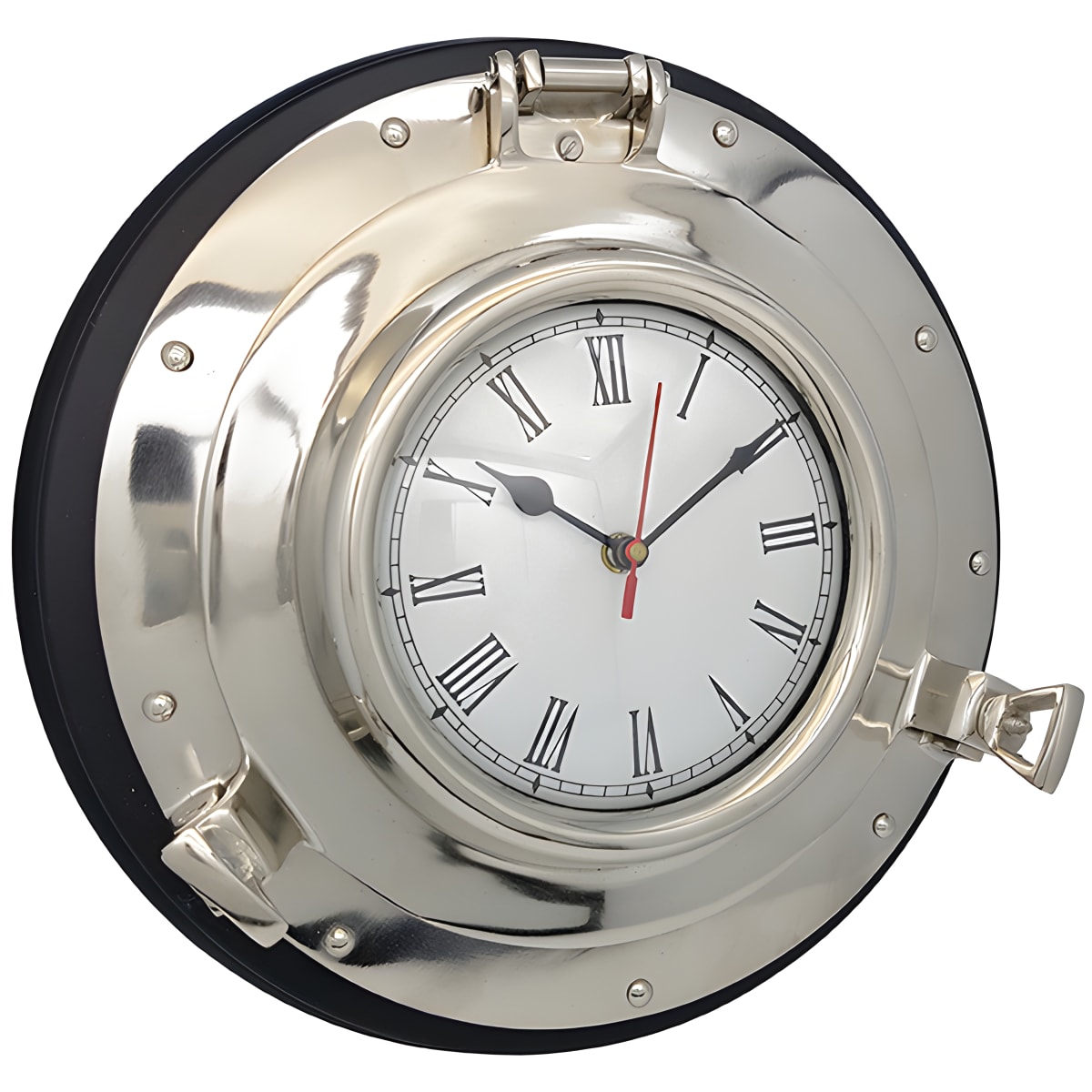 שעון קיר ייחודי בעיצוב הגה ספינה, עשוי נחושת איכותית. בעל קוטר של 15 ס"מ ומותקן על בסיס עץ עגול בקוטר 33 ס"מ, זהו פריט דקורטיבי מושלם לכל בי