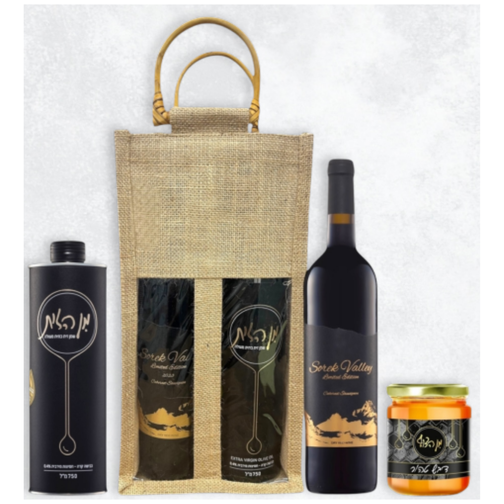 תיק יוטה ידידותי לסביבה המכיל: יין אדום יבש קברנה סוביניון עמק שורק 750 מ"ל שמן זית כתית מעולה "מן הזית" 750 מ"ל דבש טהו