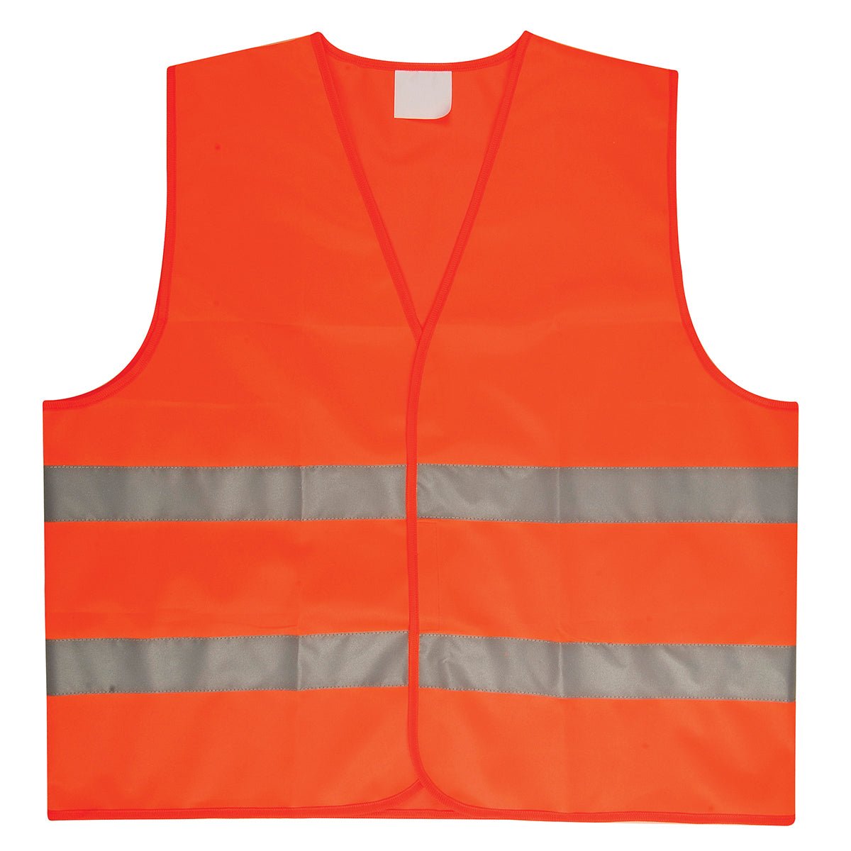 High-visibility orange safety vest for cars, compliant with EN20471 standard, one size fits all. Features reflective strips and hook-and-loop closure. Fabric weight: 120 gsm. Option to print a logo on a reflective patch using silk screen, process, or sublimation methods.