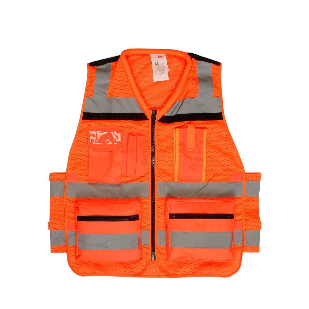 This professional high-visibility work vest features reflective stripes and meets ANSI standards. Made from high-quality mesh, it includes a chest pocket with hook-and-loop closure, name tag, and flap closure. Two waist pockets with zippers and a rear zipper pocket provide extra storage. With side adjusters and pen holders, the vest offers silk screen, process, or sublimation printing options and the addition of a logo on a reflective patch, making it perfect for safe and comfortable work.