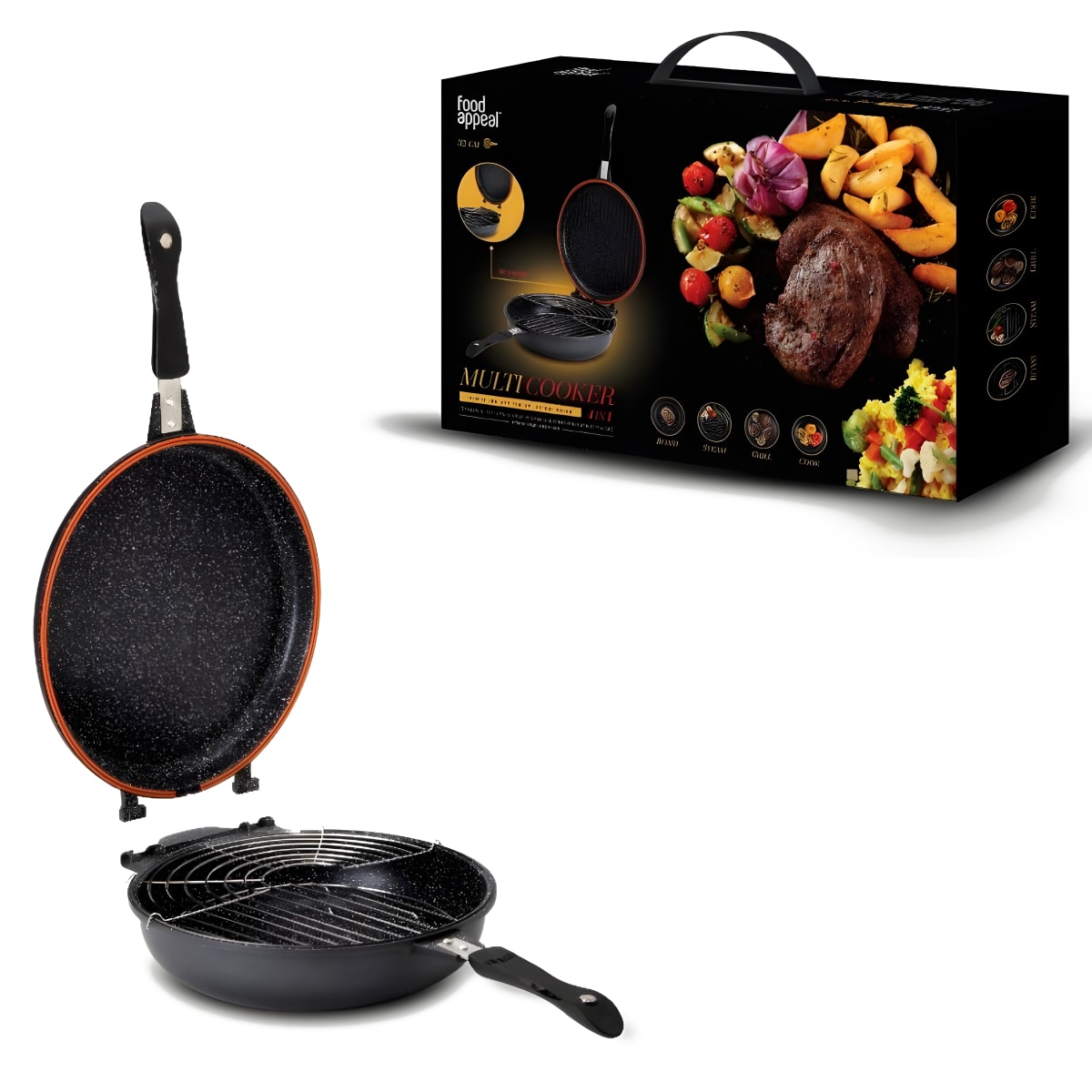 Enhance your cooking experience with the 32cm Double Deep Pan by FOOD APPEAL. This pan includes a steaming rack and a grilling rack with a durable black marble coating. Ideal for healthy steaming and grilling, perfect for home and professional use.