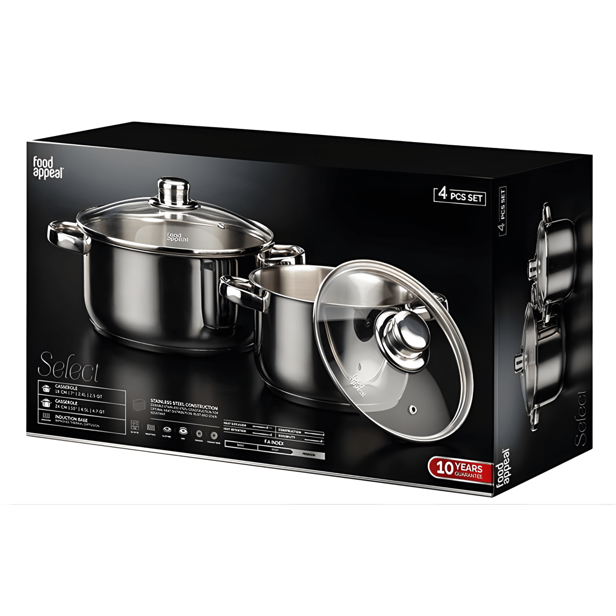 גלה מהפך במטבח עם סט כלי הבישול מנירוסטה 4 חלקים מבית Food Appeal, עשויים מנירוסטה 18/10 באיכות גבוהה המגן בפני חלודה וכתמים. ידיות ארגונומיות ולא מתחממות לאחיזה בטוחה. סט זה מתאים לכל סוגי הכיריים - גז, חשמל, קרמי ואינדוקציה, כמו גם לשימוש בתנור עד 220 מעלות. המארז כולל: