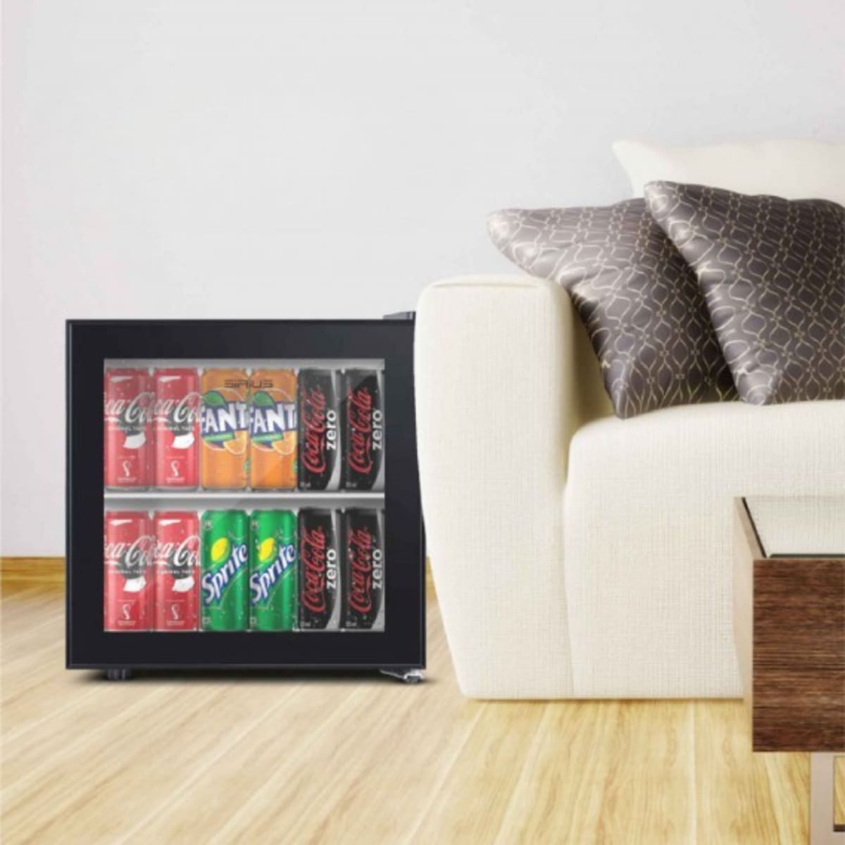 מקרר מיני בר בעיצוב מודרני וחסכון באנרגיה עם נפח קירור של 50 ליטר וידידותי לסביבה. כולל מדף רשת נשלף להתאמה אישית, תאורת LED, ודלת זכוכית וי