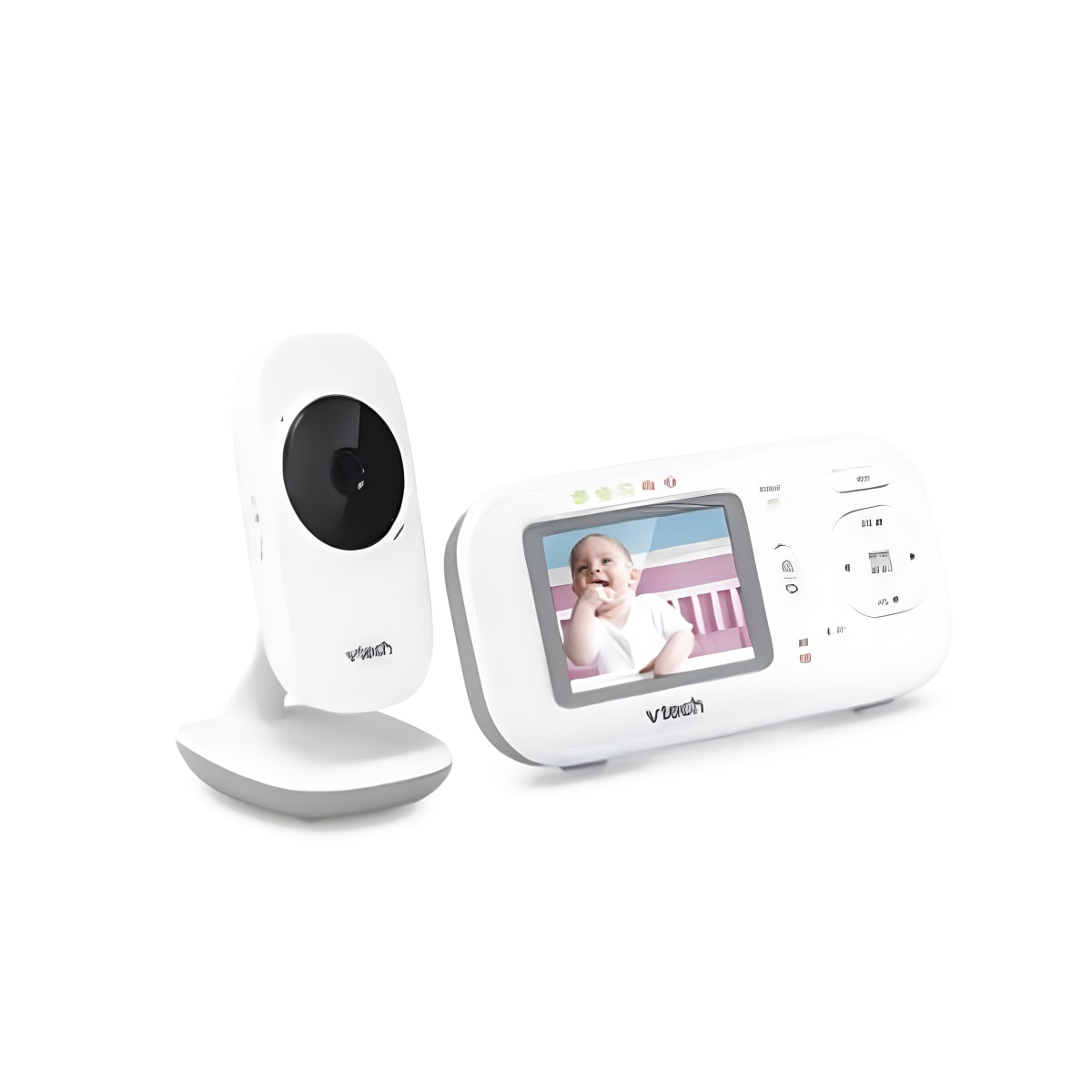 A baby monitor with a 2.4-inch colorful screen and camera. Provides high-quality audio and video transmission up to 20 frames per second, with digital noise-free sound. The camera angle can be adjusted manually and placed on a wall or furniture. Includes zoom capability and automatic night vision. Two-way communication allows for listening and speaking between units. Features sound display with LED indicators, temperature sensor, and backup via rechargeable battery. Indoor reception range up to 50 meters and outdoor up to 300 meters with low battery alert. Comes with a 12-month warranty from Semicoom Lexis.