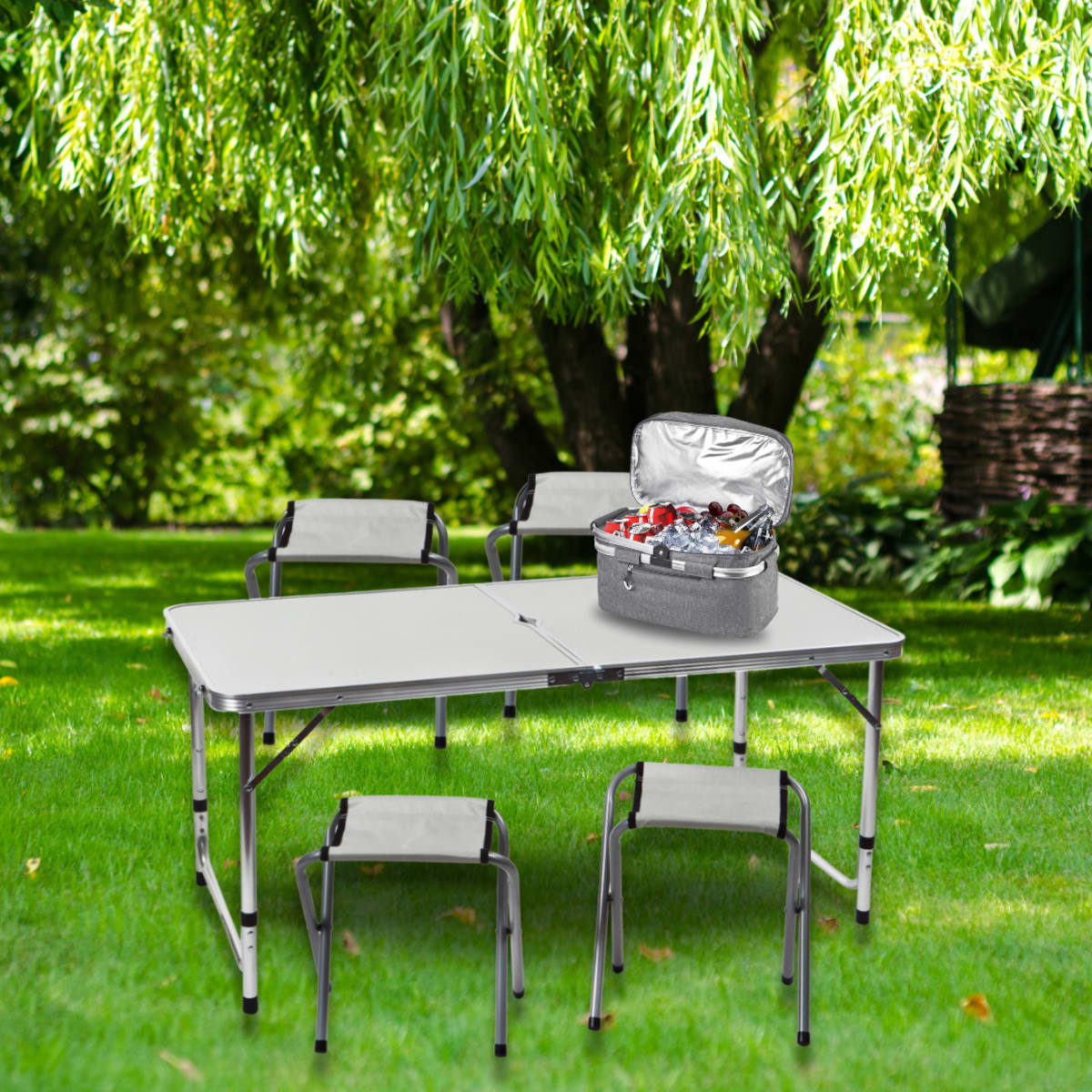 Includes a robust telescopic folding table with aluminum surface, 4 easy folding chairs, and a high-quality collapsible cooler bag.