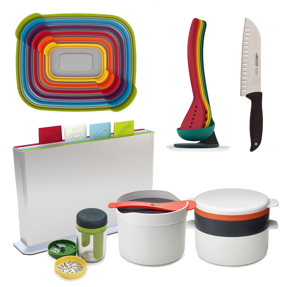 Discover the exceptional kitchen set by SOHO and ARCOS, featuring a variety of high-quality products: 4 designed cutting boards, NEST UTENSILS PLUS 6 kitchen tools, NEST 6 storage set, 4-piece microwave cooking set, microwave rice cooker set, SPIRO spiral vegetable slicer, and an 18 cm Santoku knife from ARCOS Menorca series.
