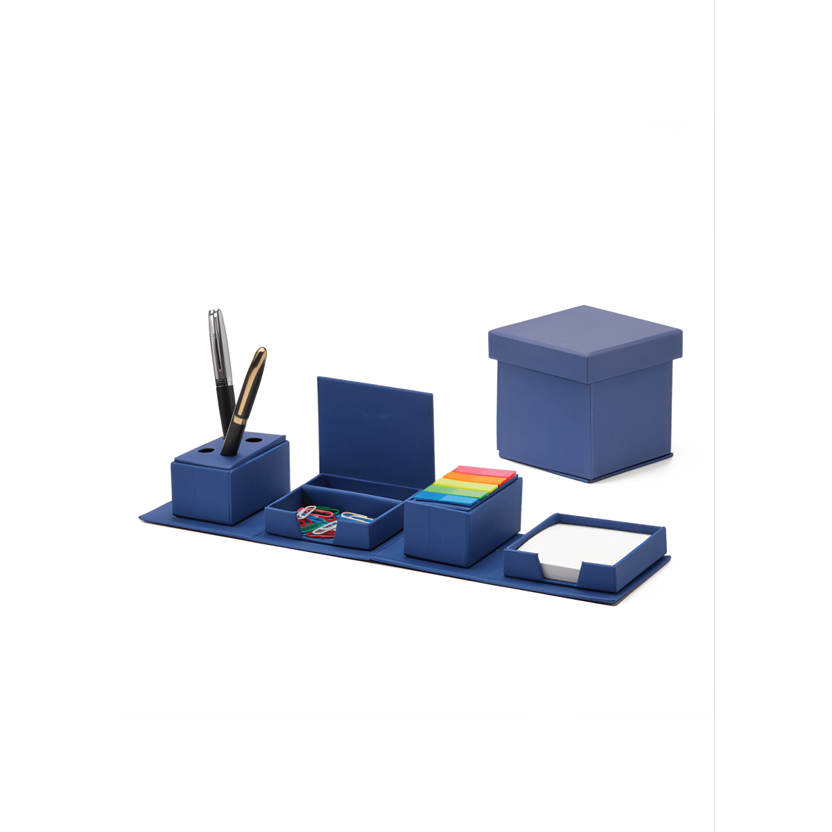 Discover the smart and compact desk organizer that fits any workspace. This folding cube organizer includes flags, memo pads, sticky clips,