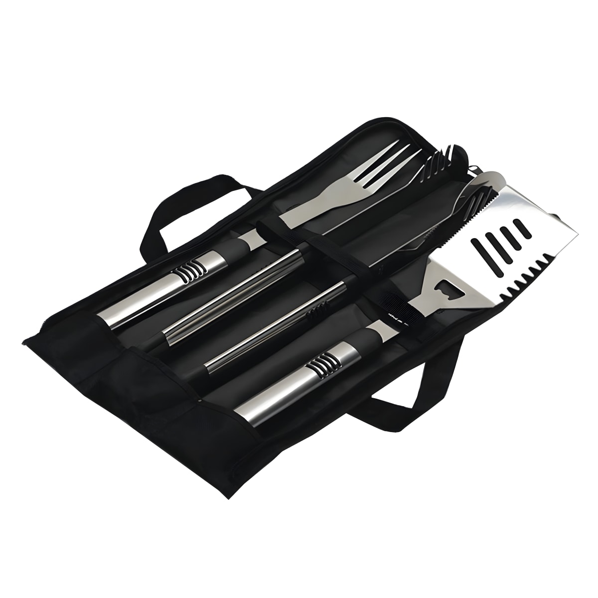 סט ברביקיו מקצועי הכולל מזלג, מלקחיים וספטולה בתוך תיק נשיאה נוח. כלי הברביקיו עשויים ממתכת אל חלד איכותית עם ידיות נירוסטה ארוכות, המאפשרות