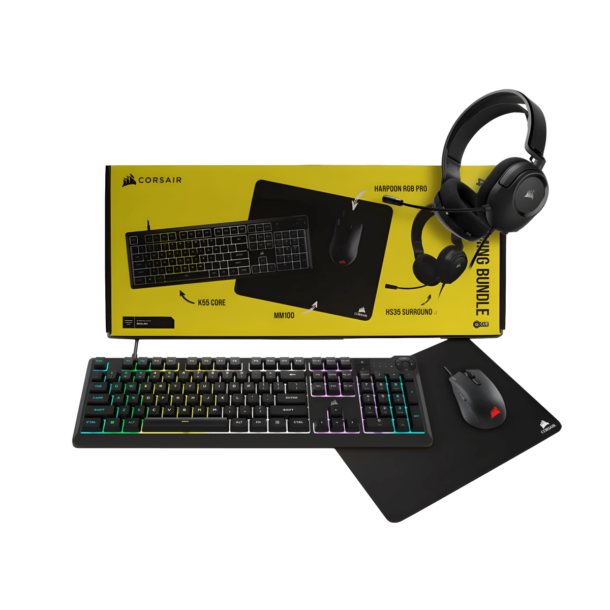גלה את ערכת הגיימינג האולטימטיבית עם מוצרי קורסאיר: מקלדת K55 RGB PRO, עכבר Harpoon RGB PRO, אוזניות HS50 ומשטח עכבר MM100 - הכול בערכה אחת!
