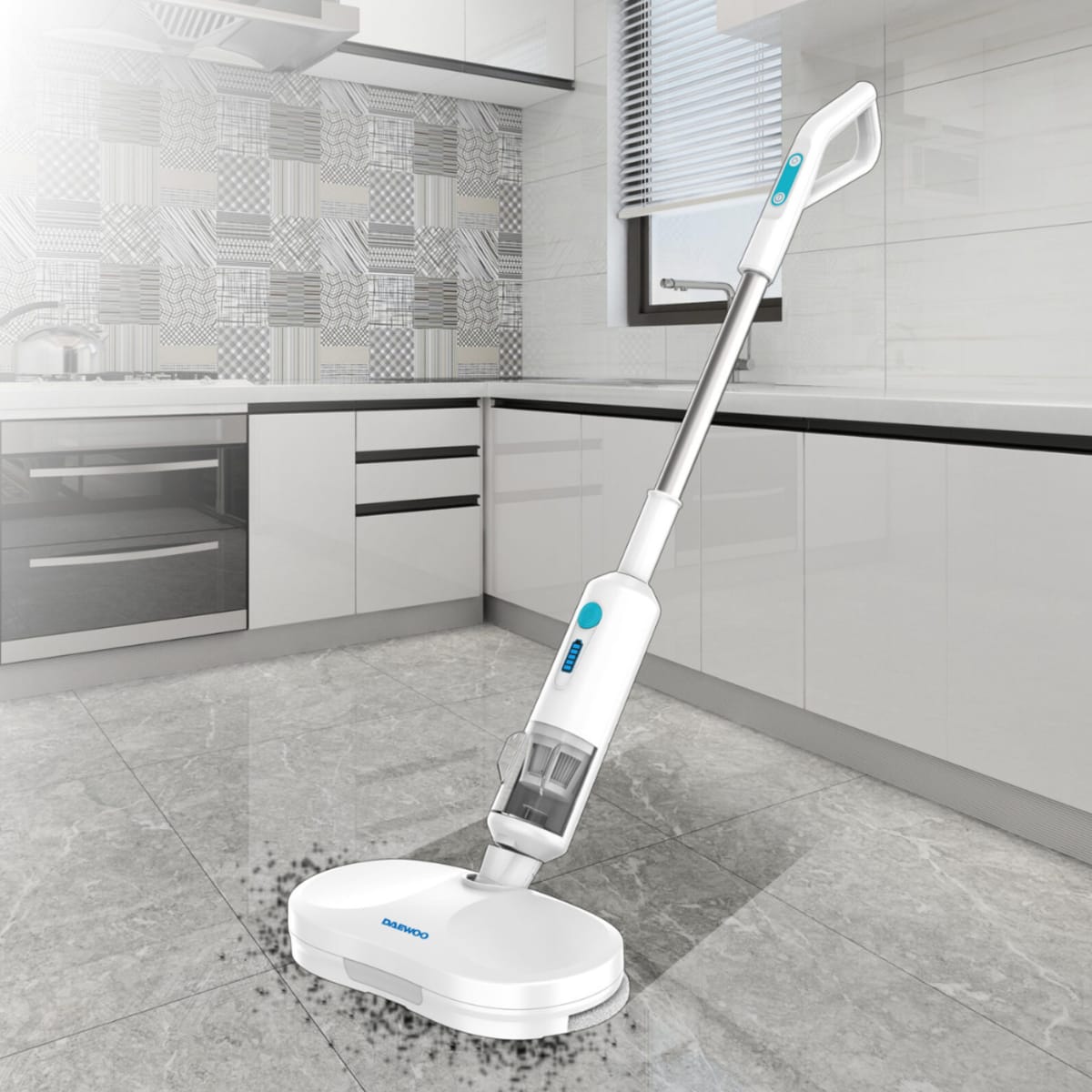 Effortlessly clean dry and wet floors! Includes detachable 2500 mAh battery. Four-in-one function with advanced pads for fast stain-free cleaning. Adjustable, user-friendly handle, ideal for ceramic, marble, parquet, and wood floors. LED front lighting, internal water tank, quick charging in 2-3 hours, and 35-50 minutes runtime without cable.