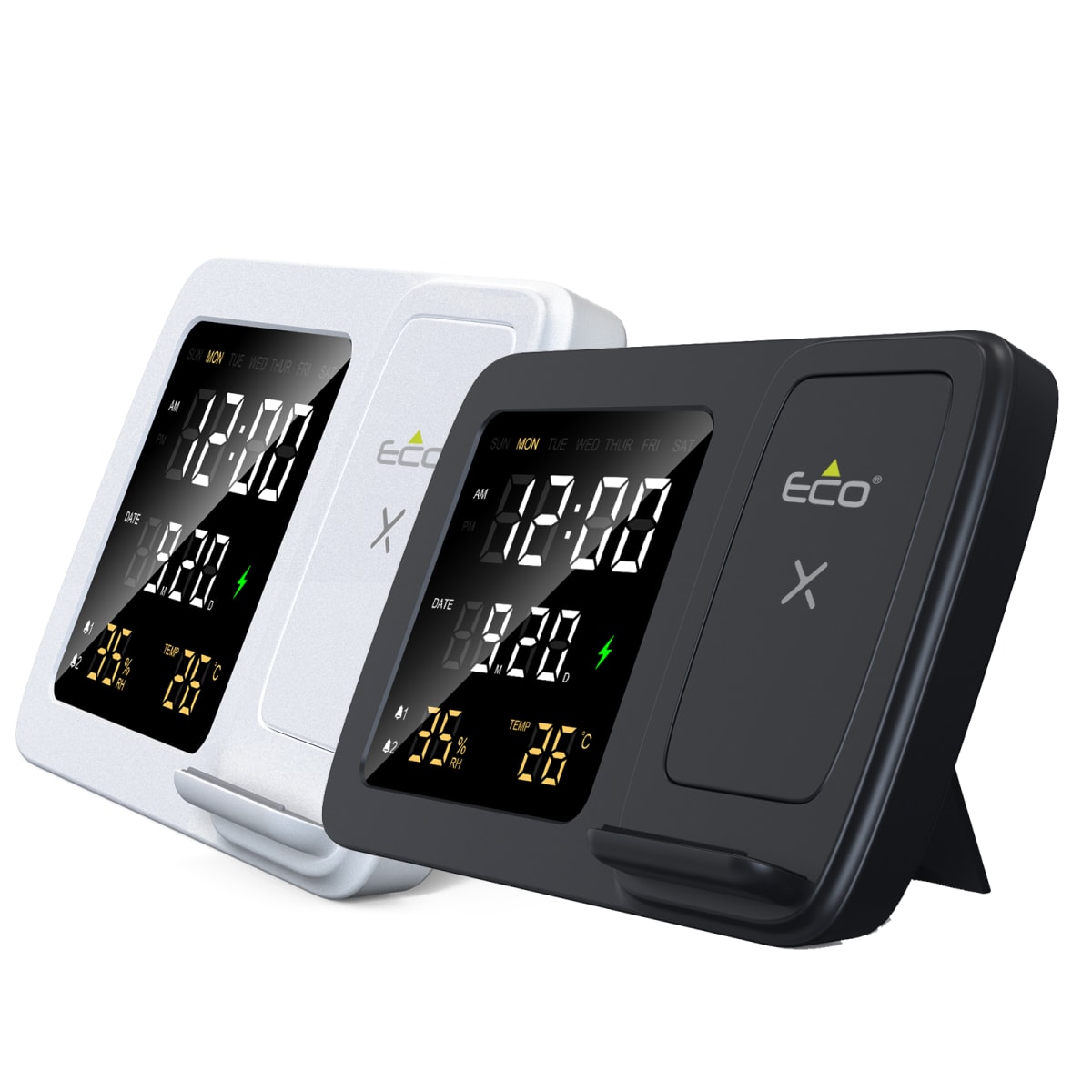 להטעין את המכשירים שלך ולהתעורר בזמן עם משטח טעינה אלחוטי רב-תכליתי מבית ECO. מגיע בצבעי שחור ולבן, ומשלב שעון דיגיטלי, שעון מעורר, תאריכון