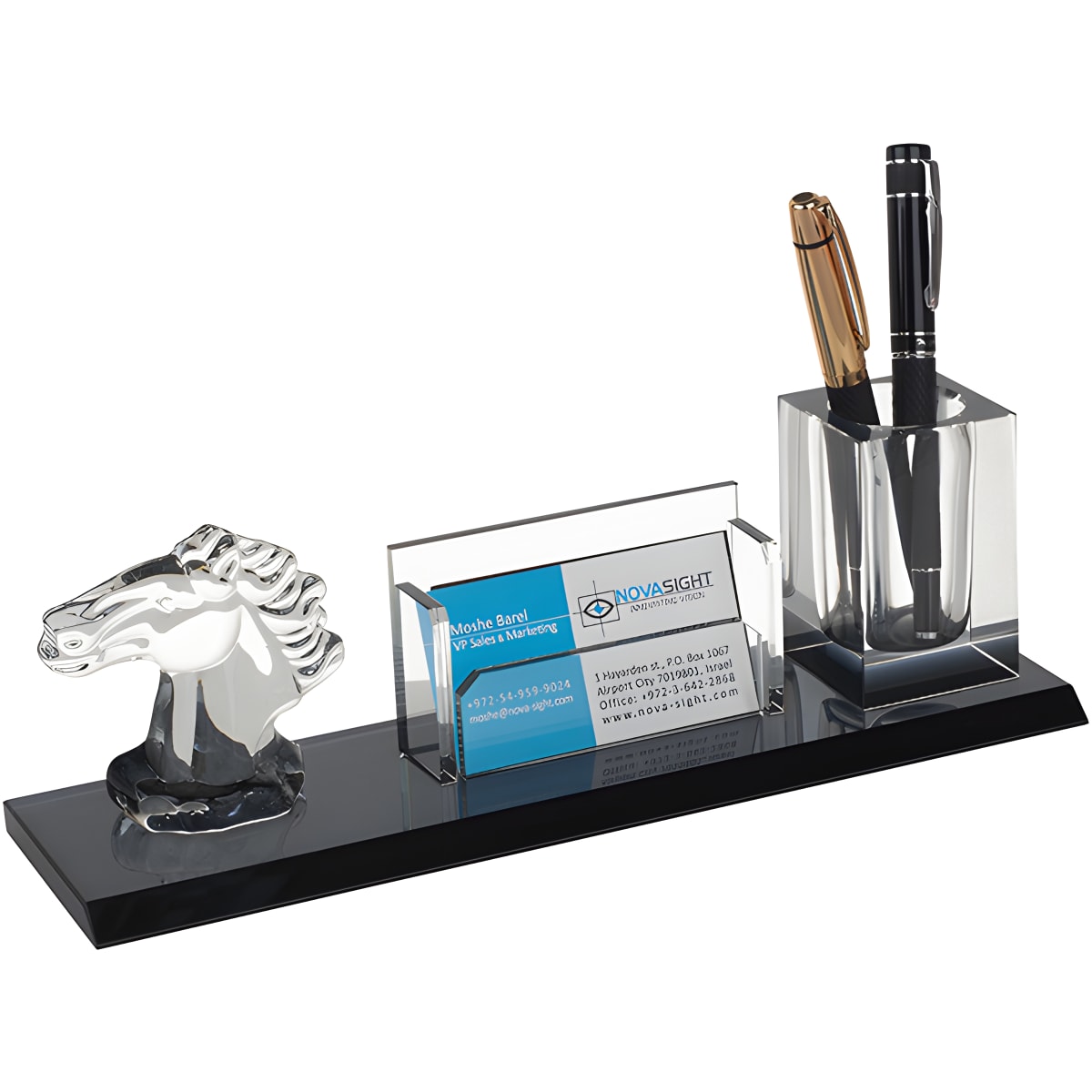 שדרגו את שולחן העבודה שלכם עם מעמד קריסטל יוקרתי הכולל כוס לעטים ומחזיק לכרטיסי ביקור. מעמד זה בגודל 29x9x8.5 ס"מ, מושלם לארגון וסדר במשרד.