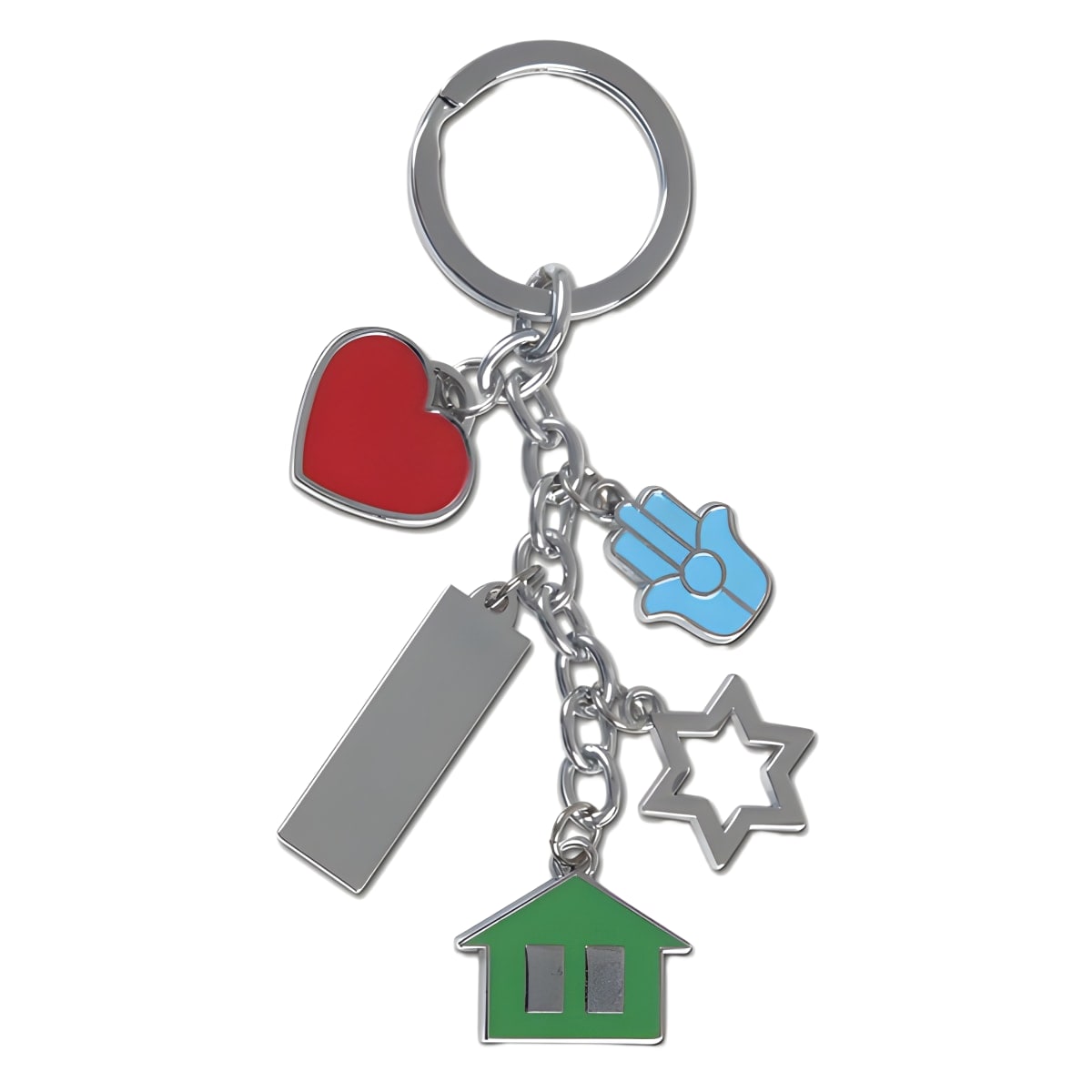 מחפשים מתנה מרשימה ושימושית? מארז מחזיק מפתחות מעוצב ומיוחד, כולל תליונים ייחודיים של בית, לב, חמסה ומגן דוד, מתאים לכל מי שאוהב לשלב אלמנטי