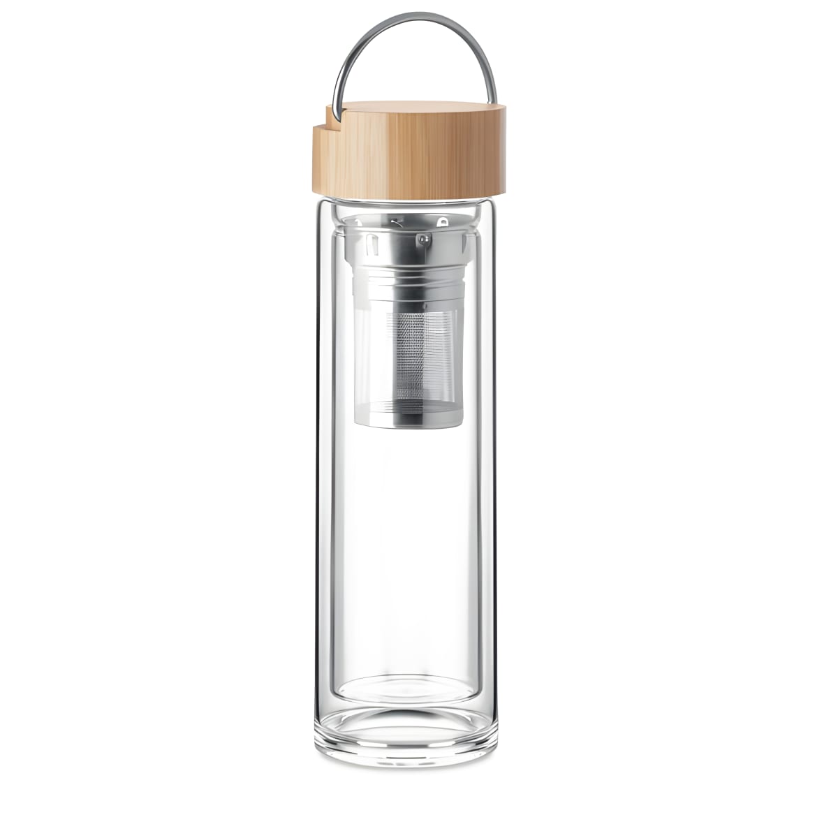 בקבוק שתייה מזכוכית איכותית עם מכסה עץ במבוק ותא מסננת משולב לתה. הבקבוק עמיד, נוח לנשיאה ומתאים לשימוש יומיומי. תהנו ממים מזון תוך כדי שמיר