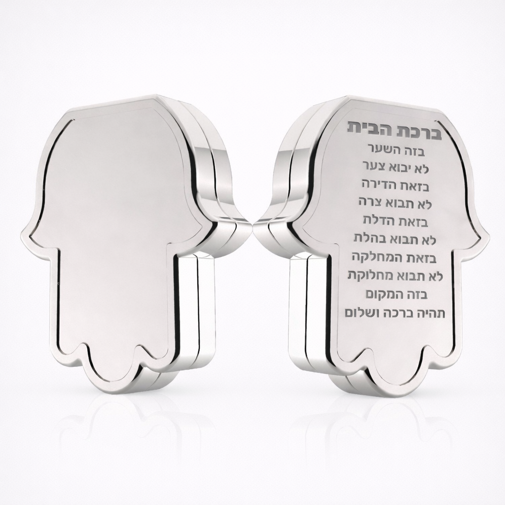 Discover the beauty and blessing with this unique set of two Hamsa-shaped magnets. Each magnet features a home blessing on one side and a sm