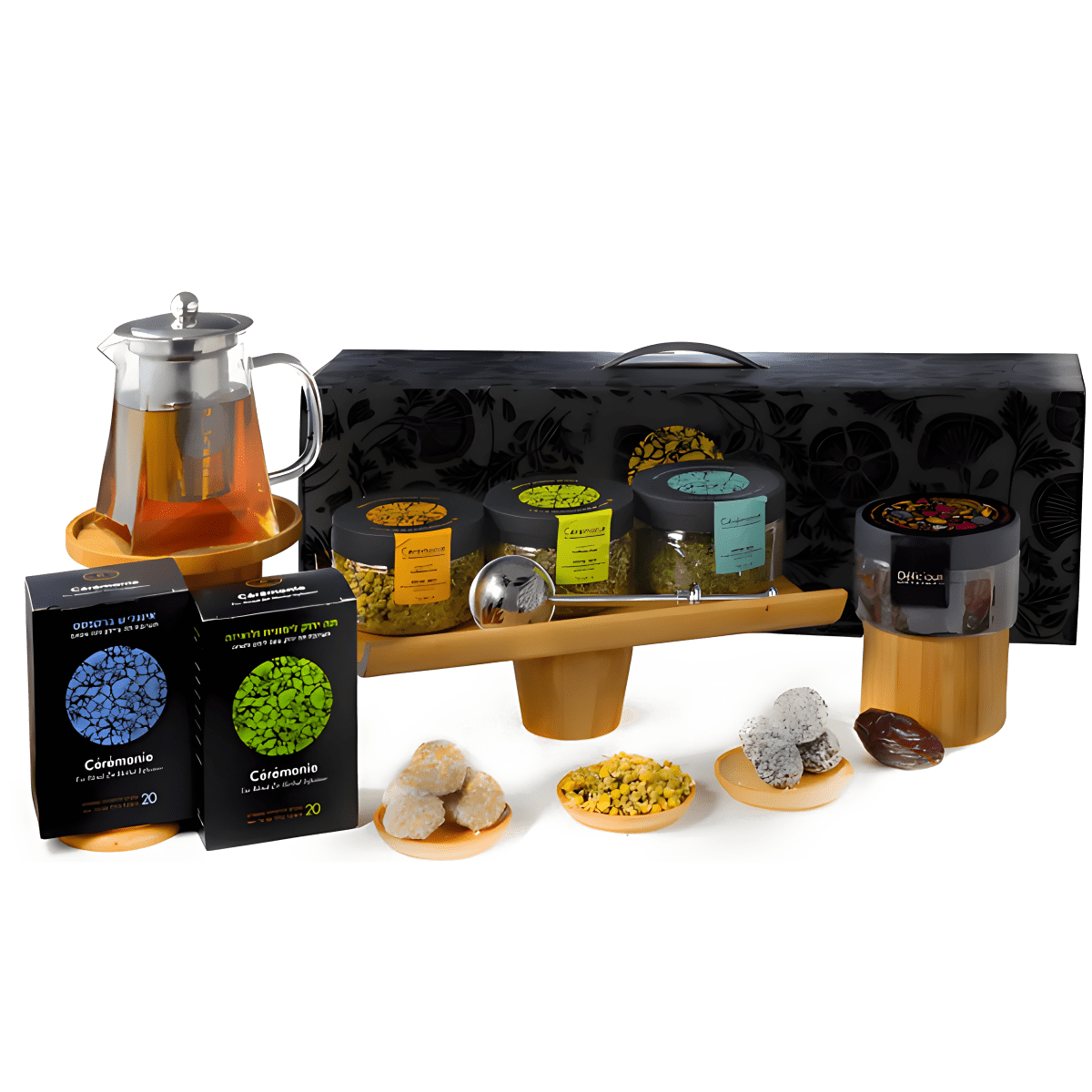 מארז חרמשון מבית סרמוני המארז מכיל: קנקן זכוכית סרמוני 750 מ"ל חולטן איכותי 100% נירוסטה מארז 20 שקיקי פירמידה - ירוק לימונ