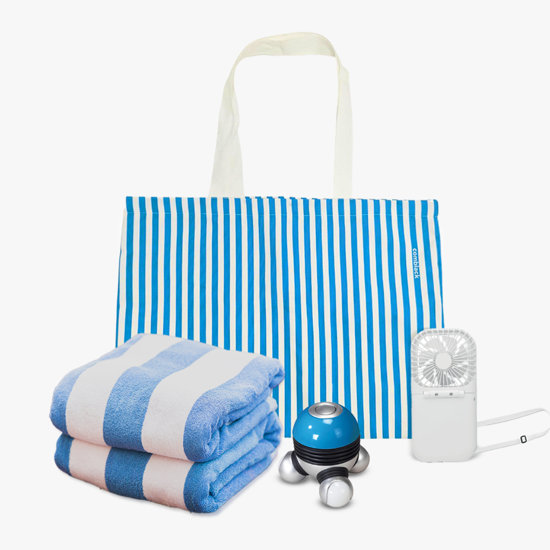 תיק חוף מעוצב, מגבת חוף גדולה, מאוורר אישי, מסאז׳ר חשמלי מפנק