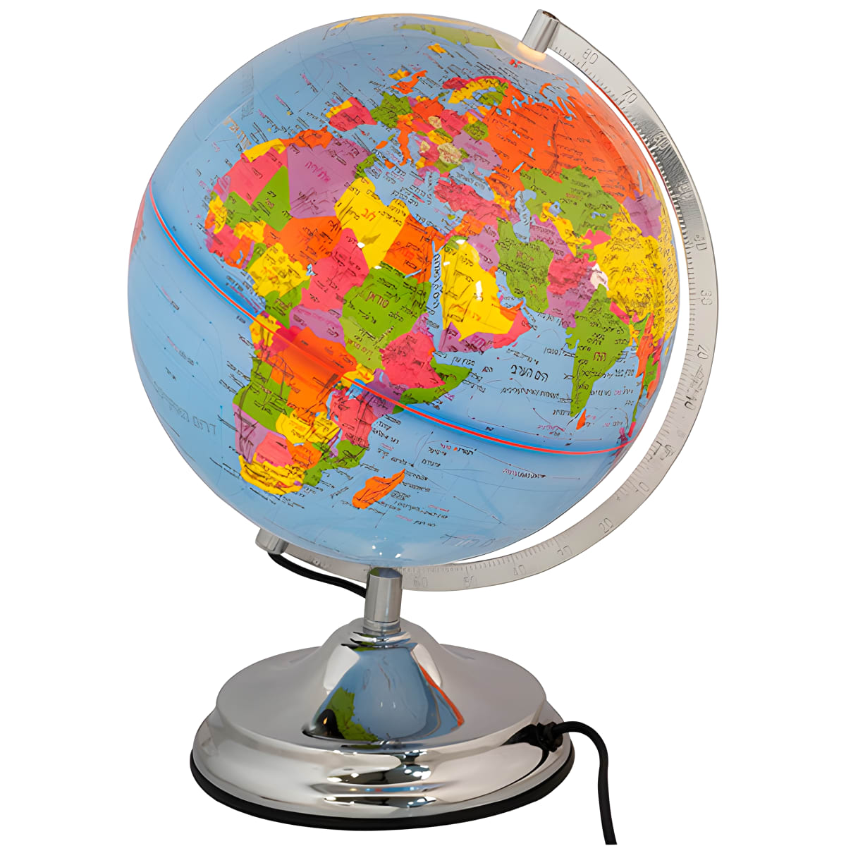 גלובוס דקורטיבי מאיר עם מפת העולם בעברית בקוטר 25 ס"מ. מושלם לקישוט הבית והמשרד, עם תאורת LED שמדגישה את פרטי המפה. הגלובוס לא רק מעשיר את ה