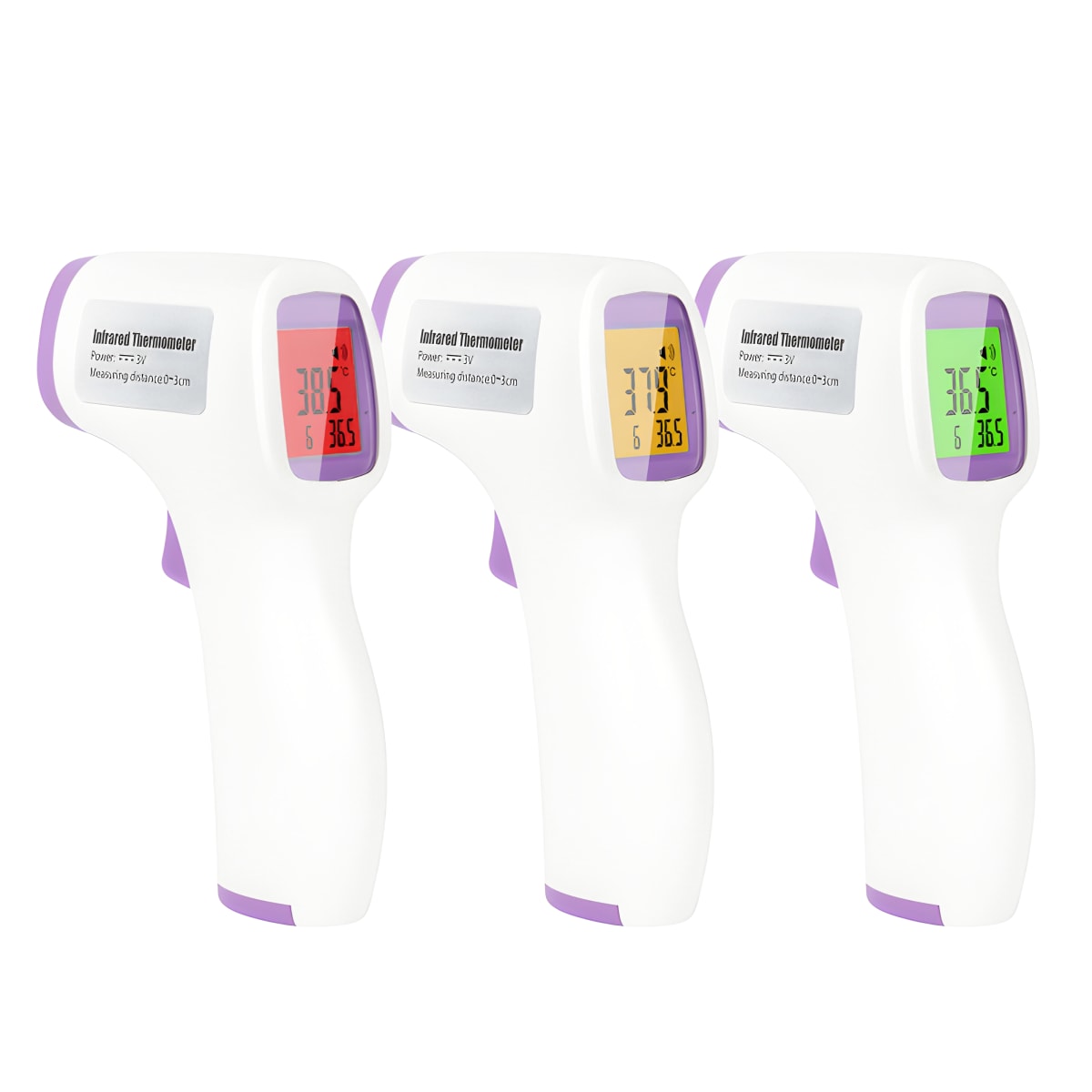 Discover our infrared no-touch medical thermometer for quick and accurate readings. With a digital heat alert system, you'll always know your body status - green light indicates normal temperature, orange signifies low fever, and red warns of high fever. Operating at a reading distance of 3-5 cm, it provides instant results. Features a precise sensor with up to +/- 0.3 degrees deviation and turns off automatically after 7 seconds. Certified by CE and FDA standards.