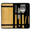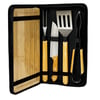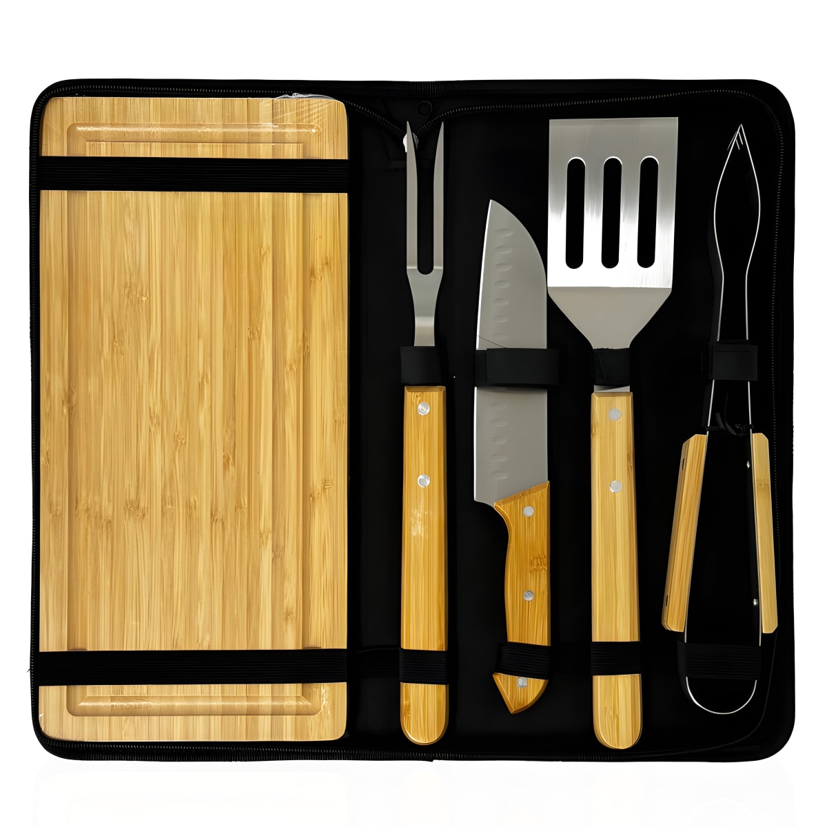 ערכת מנגל מקצועית עם כלים מפלדת אל חלד ועץ במבו, כולל 4 חלקים: מזלג, מפסק, מברשת ומלקחיים. בנוסף, משטח בוצ'ר מבוקר במיוחד מבמבוק בגודל 36X1.