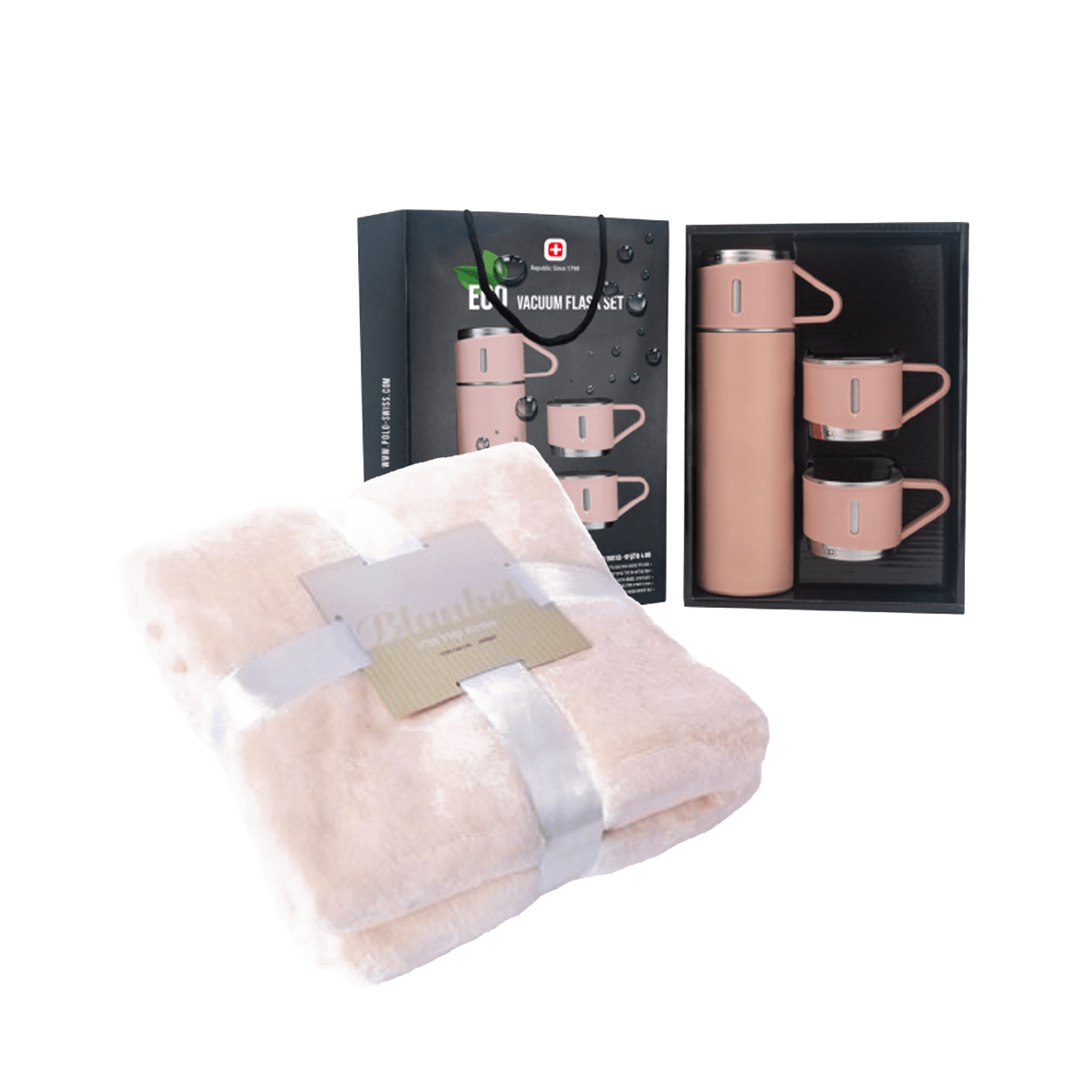 Discover the luxury heat retention set featuring a thermos with three cups and a coral fleece blanket. The thermos and cups come in a gift b