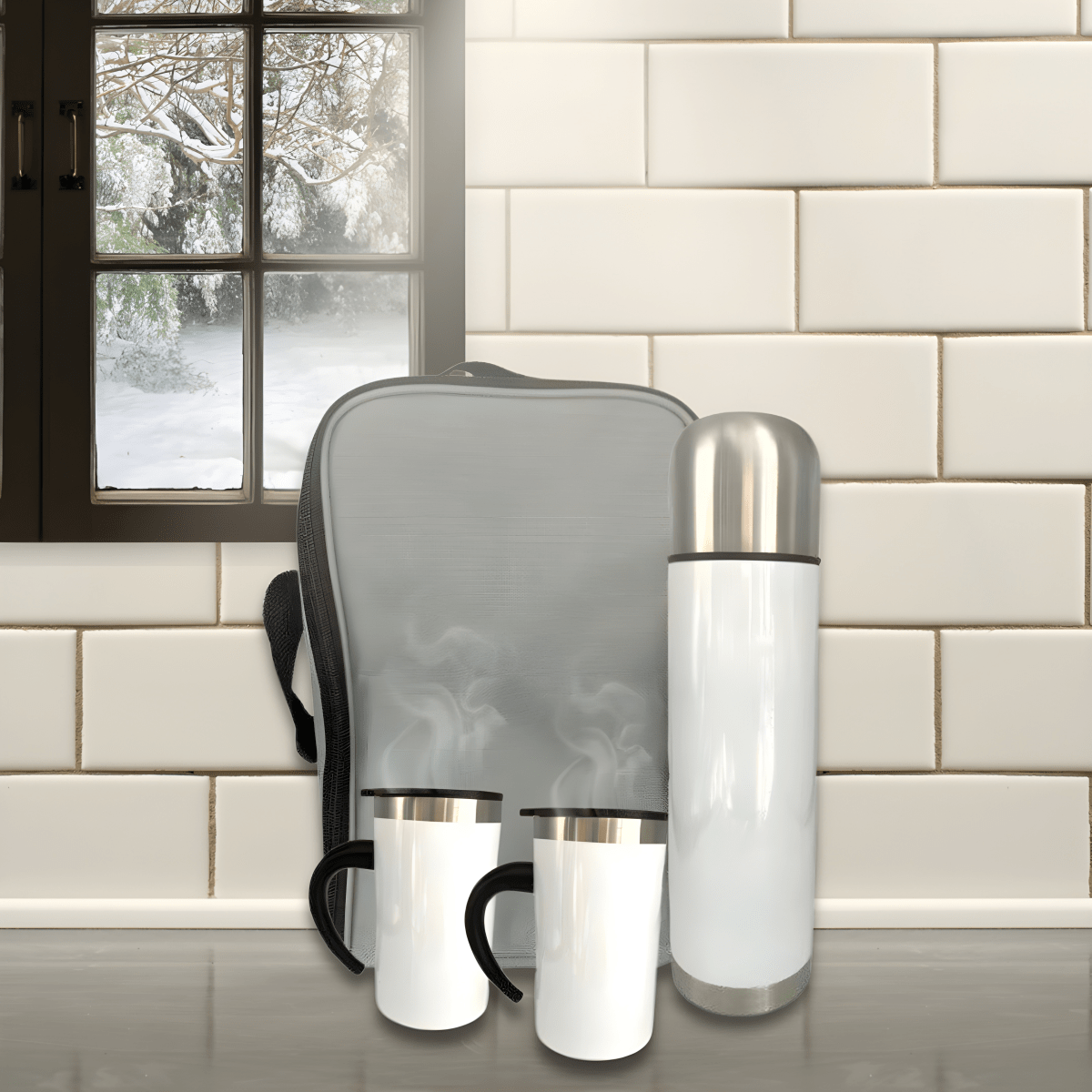 סט תרמי יוקרתי ומעוצב לנסיעות, פיקניקים וטיולים, הכולל בקבוק תרמוס וכוסות תרמיות מעוצבות. השאירו את המשקאות חמים או קרים לאורך זמן עם תיק נש