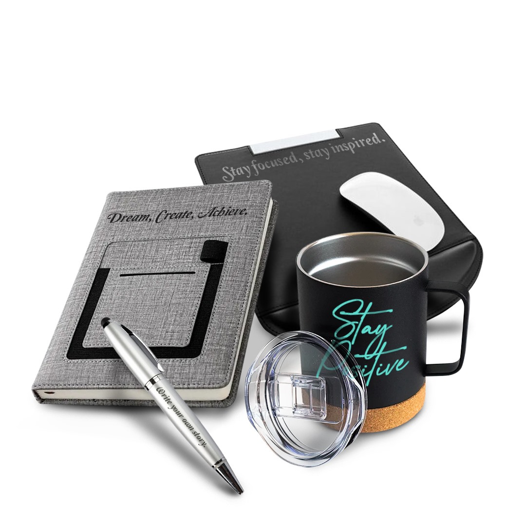 An elegant office gift set that includes an inspirational notebook, a desk mug, and a high-quality pen. Perfect for employees and managers,