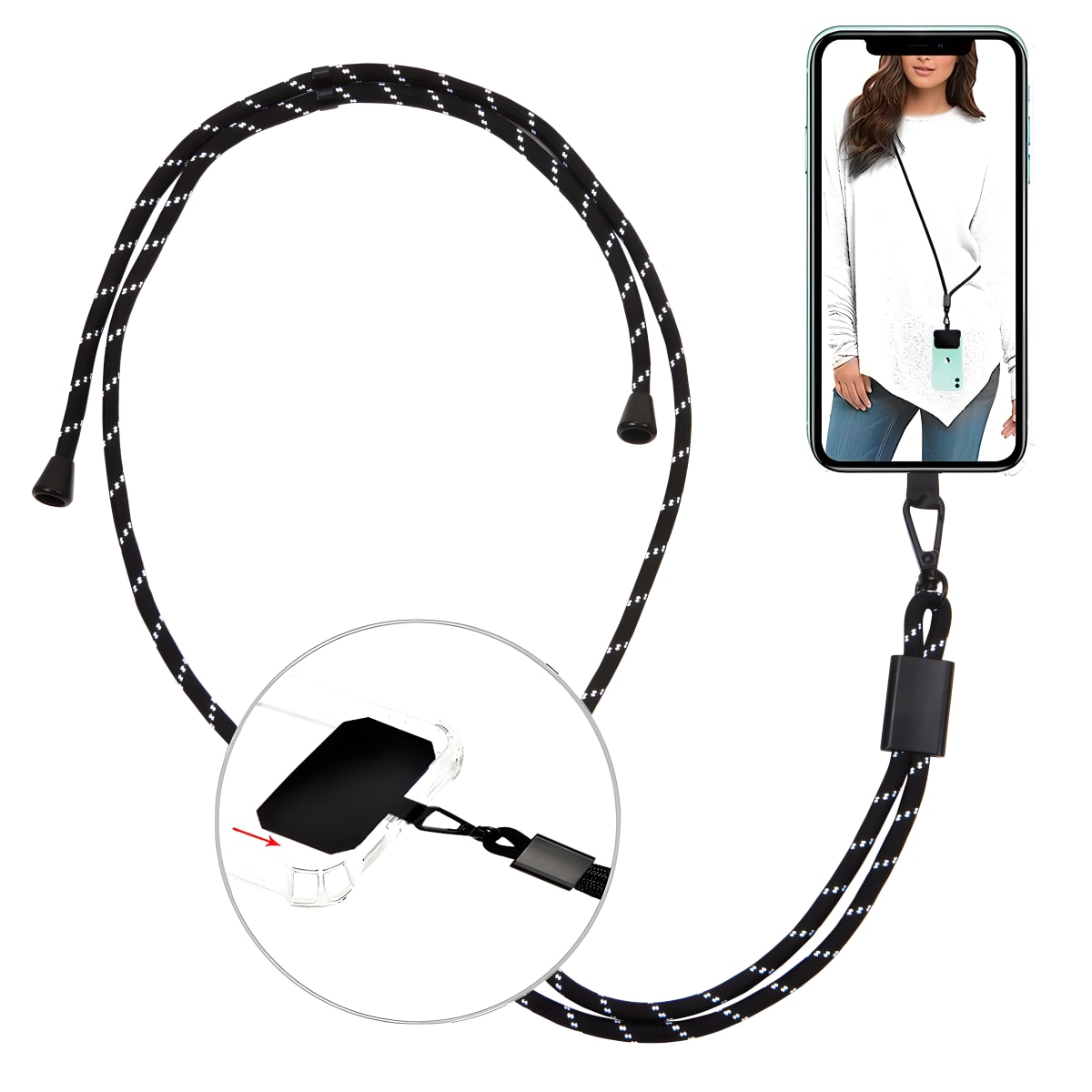 שרוך נשיאה איכותי לטלפון עם אבזם מתכת מחובר לכרטיס ניילון. מתאים לכל כיסוי טלפון ומאפשר תחושת ביטחון כשידיכם חופשיות.