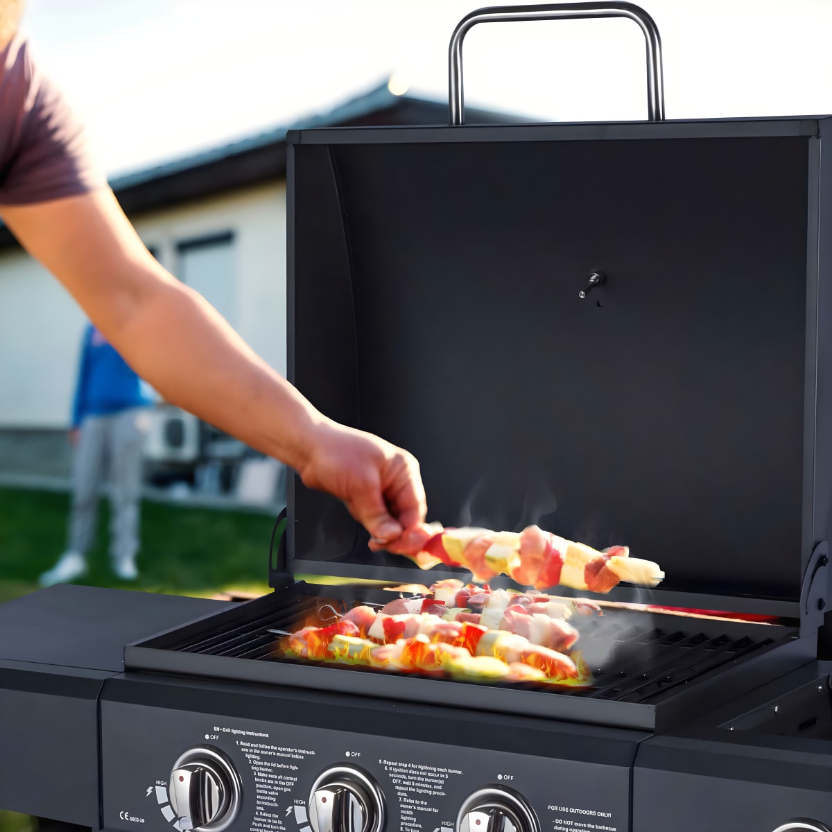 חוויית גריל גז בלתי נשכחת עם 3 מבערי נירוסטה עוצמתיים של 10,000 BTU כל אחד והצתה אלקטרונית קלה. כירת צד נוספת עם מבער עוצמתי של 12,000 BTU ל