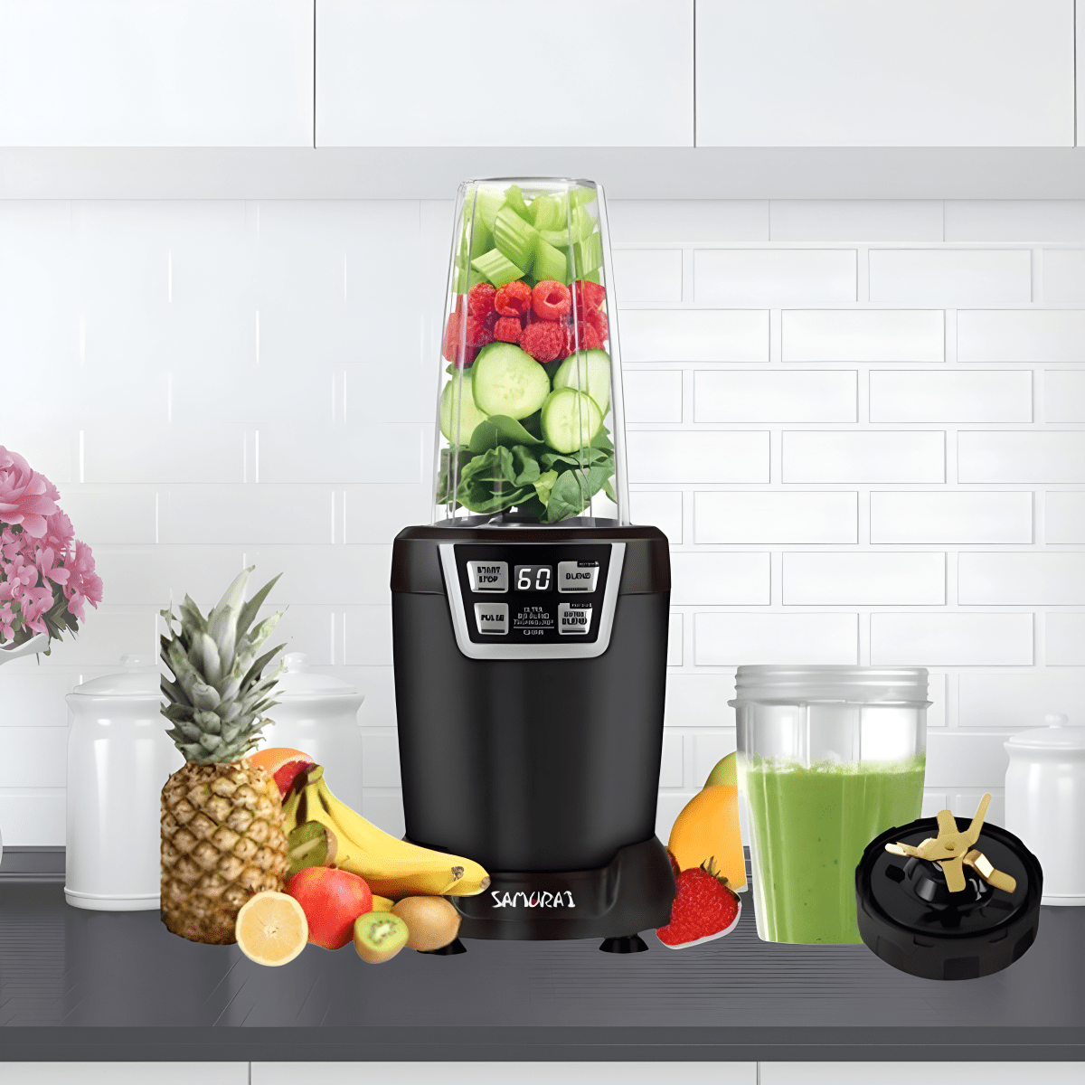 בלנדר סמוראי משדרג את חווית ההכנה במטבח שלך. עם מנוע 1200W חזק ולהבים מטיטניום מוזהבים לעיבוד מדויק ומהיר תוך שמירת ערכי התזונה. לוח הפקודות