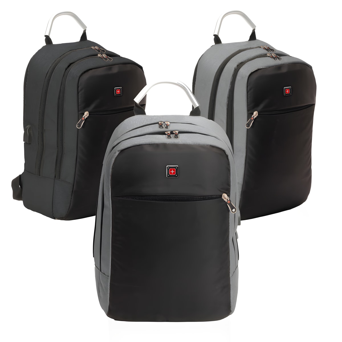 תיק גב איכותי מבית המותג SWISS, עשוי בד מלאנז' בשילוב מיקרופייבר, כולל יציאת USB להטענה נוחה. כולל 3 תאים גדולים לנוחות שימוש, ידית אלומיניו