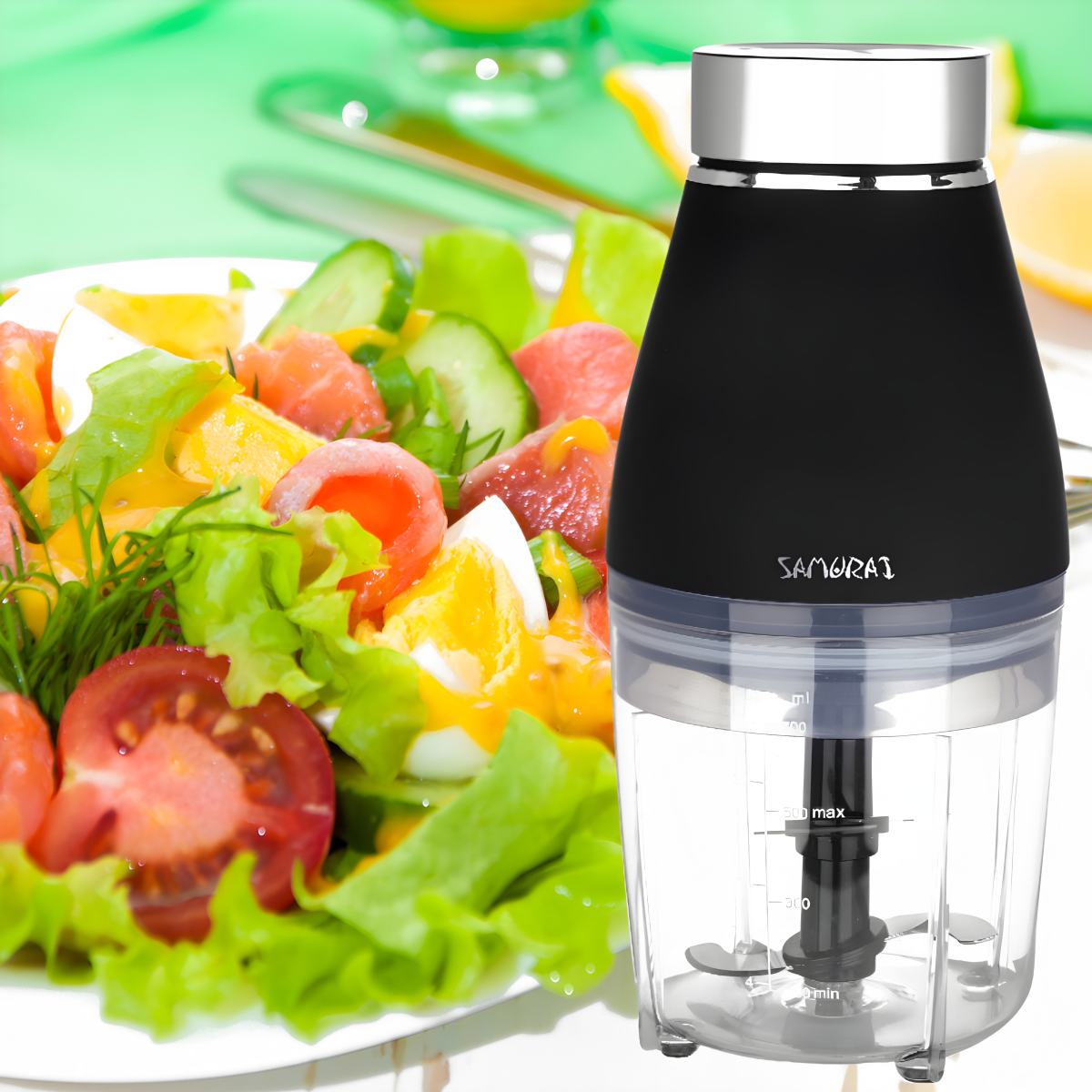 קוצץ מזון מקצועי על ידי SAMURAI עם 4 להבים חזקים לקיצוץ מגוון סוגי מזון בקלות ובמהירות. אידיאלי לחיתוך בצל, שום, עשבי תיבול, בשר, אגוזים ובי
