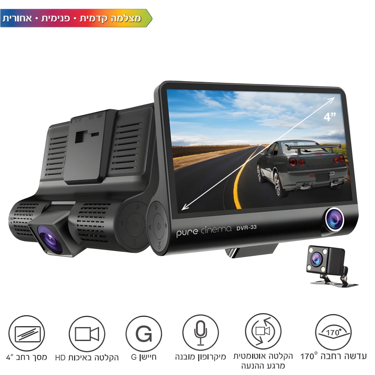 מצלמת הדש משולשת של PURE CINEMA מספקת חווית נהיגה מתקדמת ובטוחה. המצלמה כוללת הקלטה פנימית וחיצונית ברזולוציית 1080P עם ראיית לילה איכותית.
