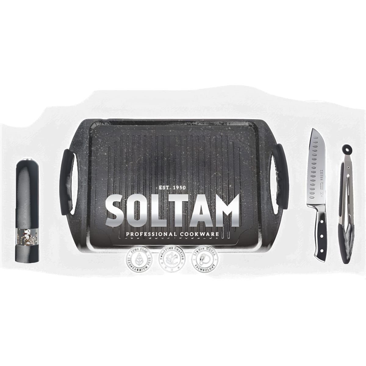 This set includes: a 26x34 cm grill plate, grinder, knife, and tongs with a high-quality Mineral Stone coating. Made from cast aluminum for
