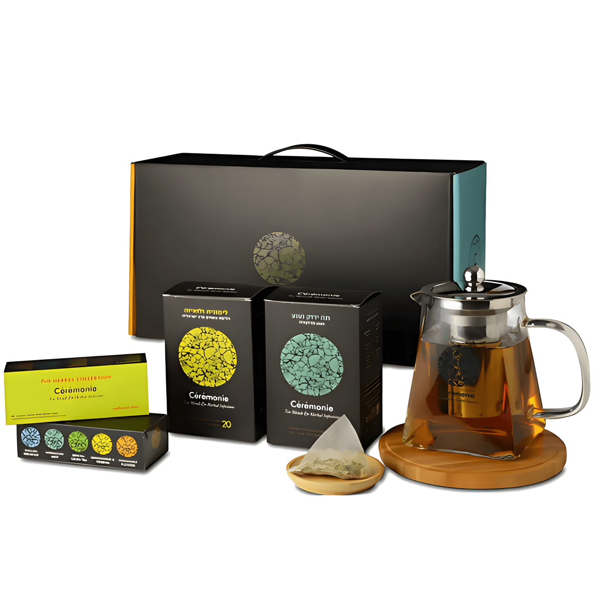 מארז צופית מבית סרמוני המארז מכיל: קנקן זכוכית סרמוני 750 מ"ל מארז 20 שקיקי פירמידה - לימונית ולואיזה מארז 20 שקיקי פירמידה
