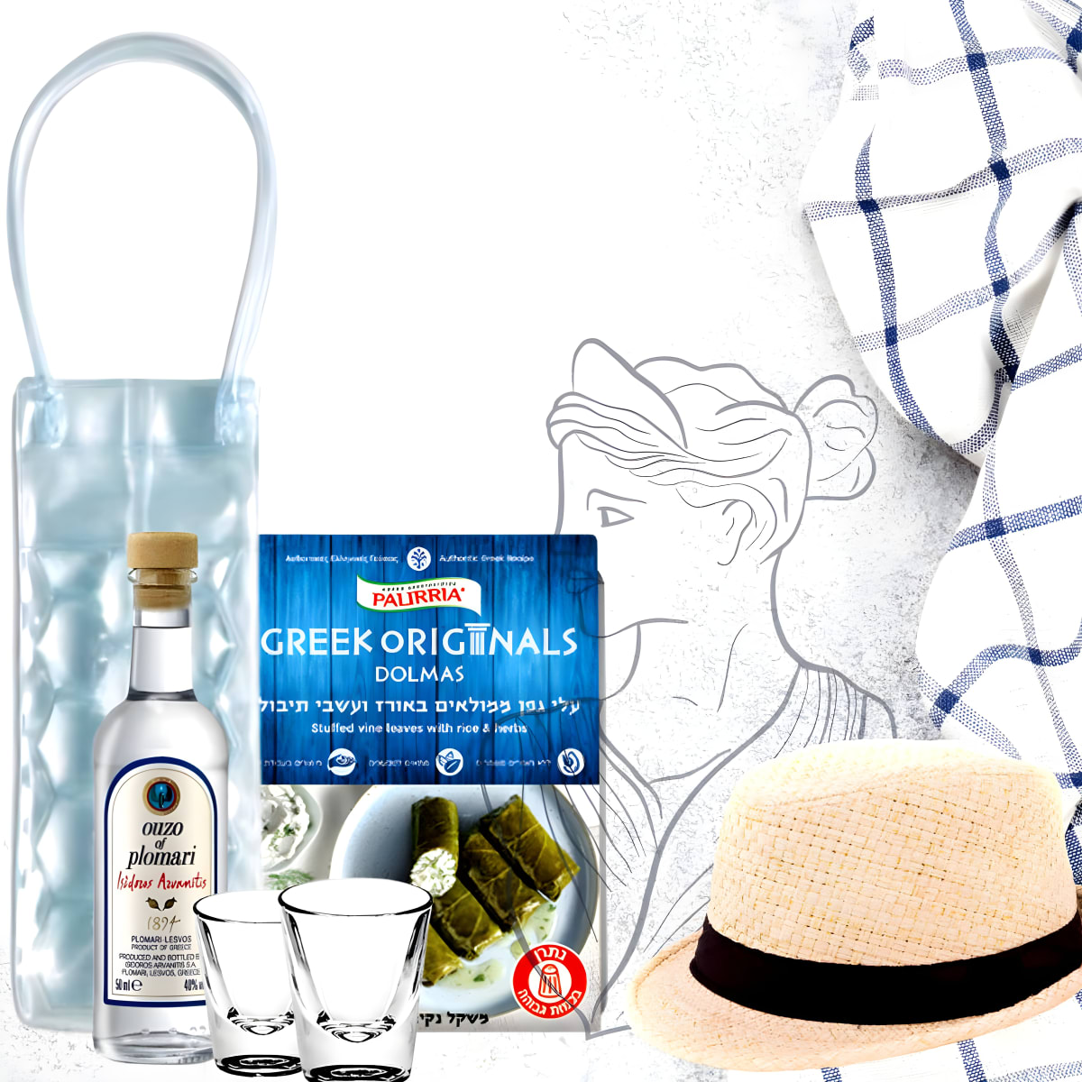 הכירו את הסט המתנות המושלם בסגנון יווני! הסט כולל צידנית איכותית לבקבוק, בקבוק אוזו מיני, שתי כוסות צ'ייסר, כובע קש, ומתאבן עלי גפן ממול